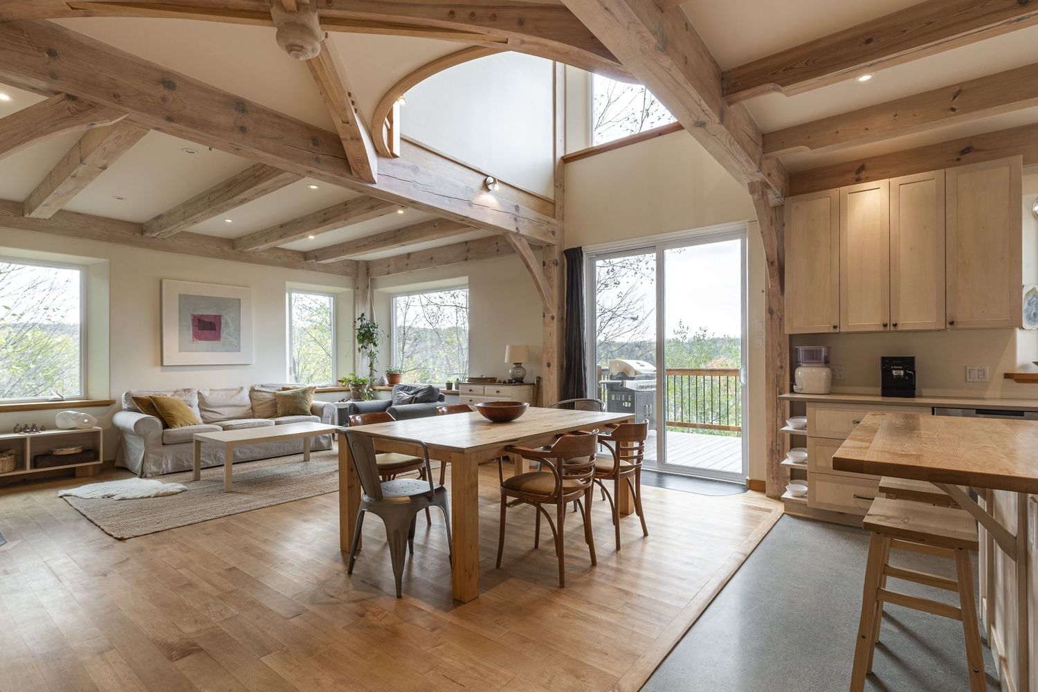 Sa remarquable structure en poutres et poteaux, réalisée par un artisan charpentier, est à l'honneur dans l'espace intérieur, donnant un cachet unique à la maison. La mezzanine et les aires de vie du premier étage sont lumineuses grâce à la fenestration abondante au sud. La terrasse côté sud, l'entrée de la maison et le garage ouvert sont agrémentés de structures en bois architecturales.