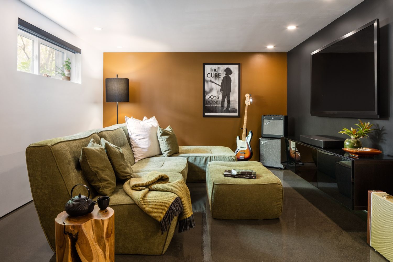 Au sous-sol, la nouvelle dalle exposée avec plancher chauffant maximise la hauteur libre sous le plafond. Avec tout cet espace en plus, une salle de bain, une buanderie et même une salle de cinéma avec un coin musique ont été ajoutées. Plus besoin d’aller bien loin pour passer une belle soirée.
