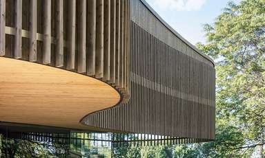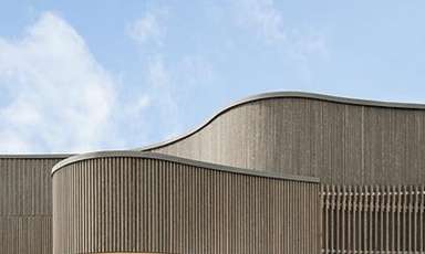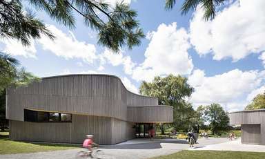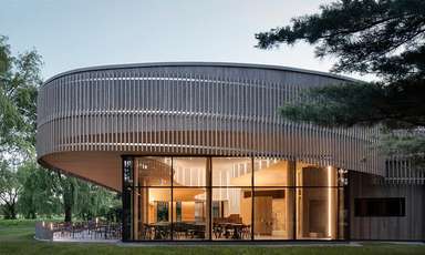 Le pourtour ondulé des bâtiments s’harmonise avec l’environnement naturel et encourage une déambulation fluide autour des espaces construits. L’usager longe, traverse et passe en dessous des surfaces courbes pour progressivement découvrir l’espace. Le mouvement fluide de la forme est de plus accentué par un voilage texturé : une succession de baguettes de bois superposées au parement sur tout son périmètre. Le voile sert également de filtre pour la lumière et produit des jeux d’ombrages dansants au sol de la même manière que le feuillage tombant des saules qui ornent le site.