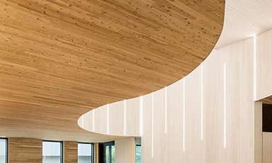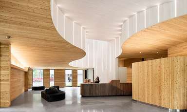 À l’intérieur, le tracé organique se poursuit par une fissure sinueuse qui se dirige vers le cœur du bâtiment : le puits de lumière.  Agrémenté de luminaires linéaires dialoguant avec le voile ondulé à l’extérieur, ce sillon lumineux anime la grande salle de découverte. Puisqu’incliné, ce tracé saisissant permet également de diriger l’air vers le puits de lumière pour profiter d’une ventilation naturelle.