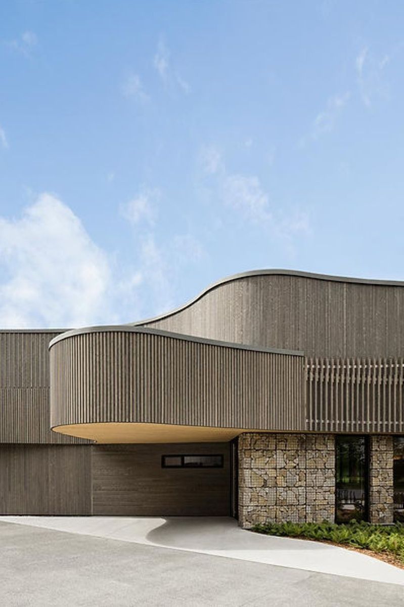 Le pourtour ondulé des bâtiments s’harmonise avec l’environnement naturel et encourage une déambulation fluide autour des espaces construits. L’usager longe, traverse et passe en dessous des surfaces courbes pour progressivement découvrir l’espace. Le mouvement fluide de la forme est de plus accentué par un voilage texturé : une succession de baguettes de bois superposées au parement sur tout son périmètre. Le voile sert également de filtre pour la lumière et produit des jeux d’ombrages dansants au sol de la même manière que le feuillage tombant des saules qui ornent le site.