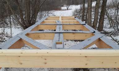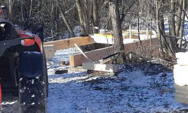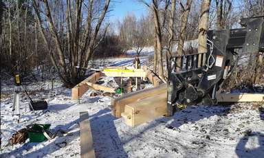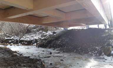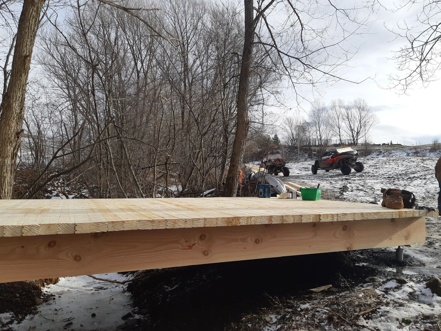 Réalisation d'un pont de bois massif. Essence : sapins douglas et spf Recherches associées Travaux - Aménagement paysager Sherbrooke (Estrie) Patrimoine bâti Pont Charpente massive Charpenterie Timber frame