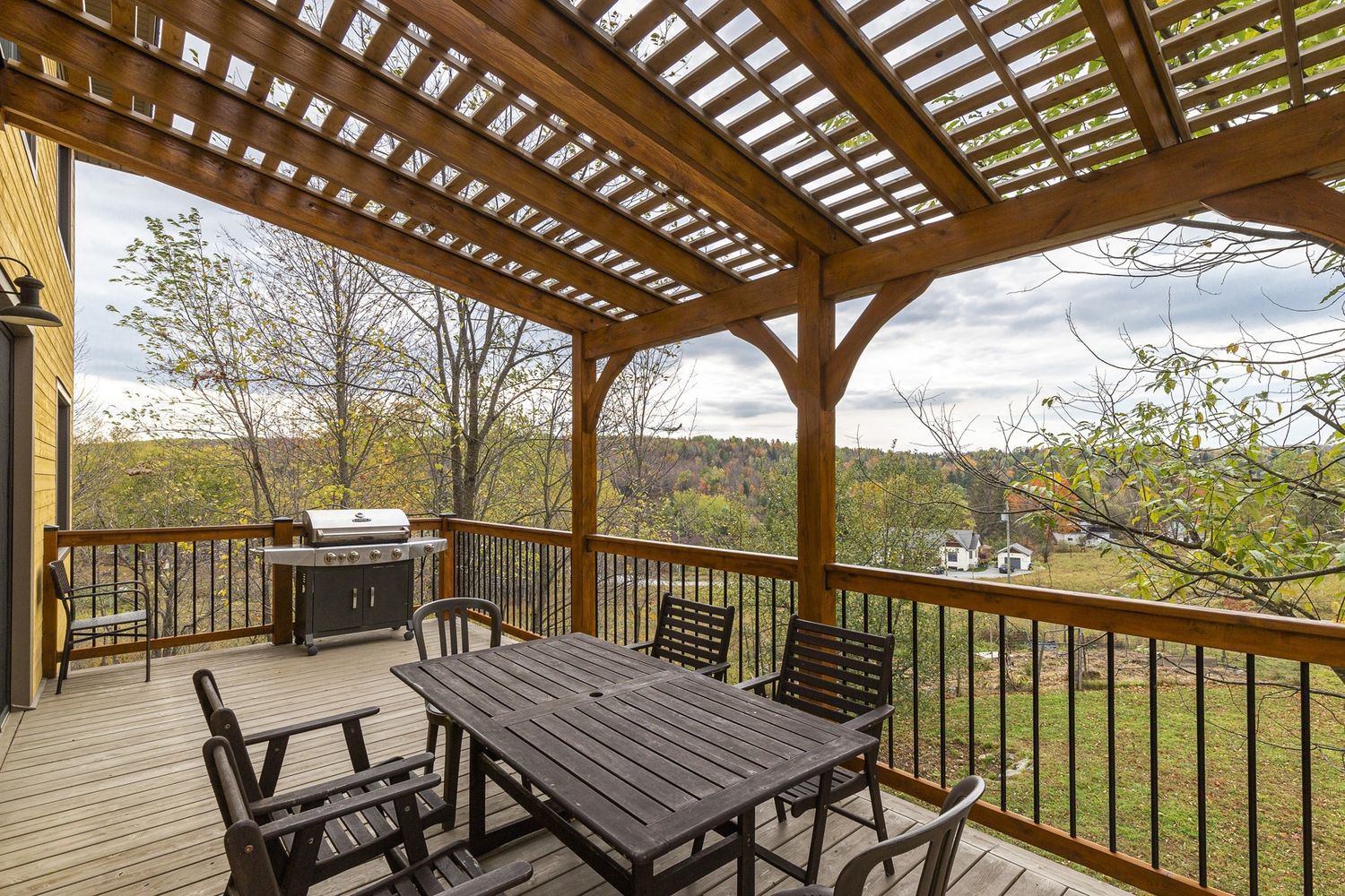 Sa remarquable structure en poutres et poteaux, réalisée par un artisan charpentier, est à l'honneur dans l'espace intérieur, donnant un cachet unique à la maison. La mezzanine et les aires de vie du premier étage sont lumineuses grâce à la fenestration abondante au sud. La terrasse côté sud, l'entrée de la maison et le garage ouvert sont agrémentés de structures en bois architecturales.