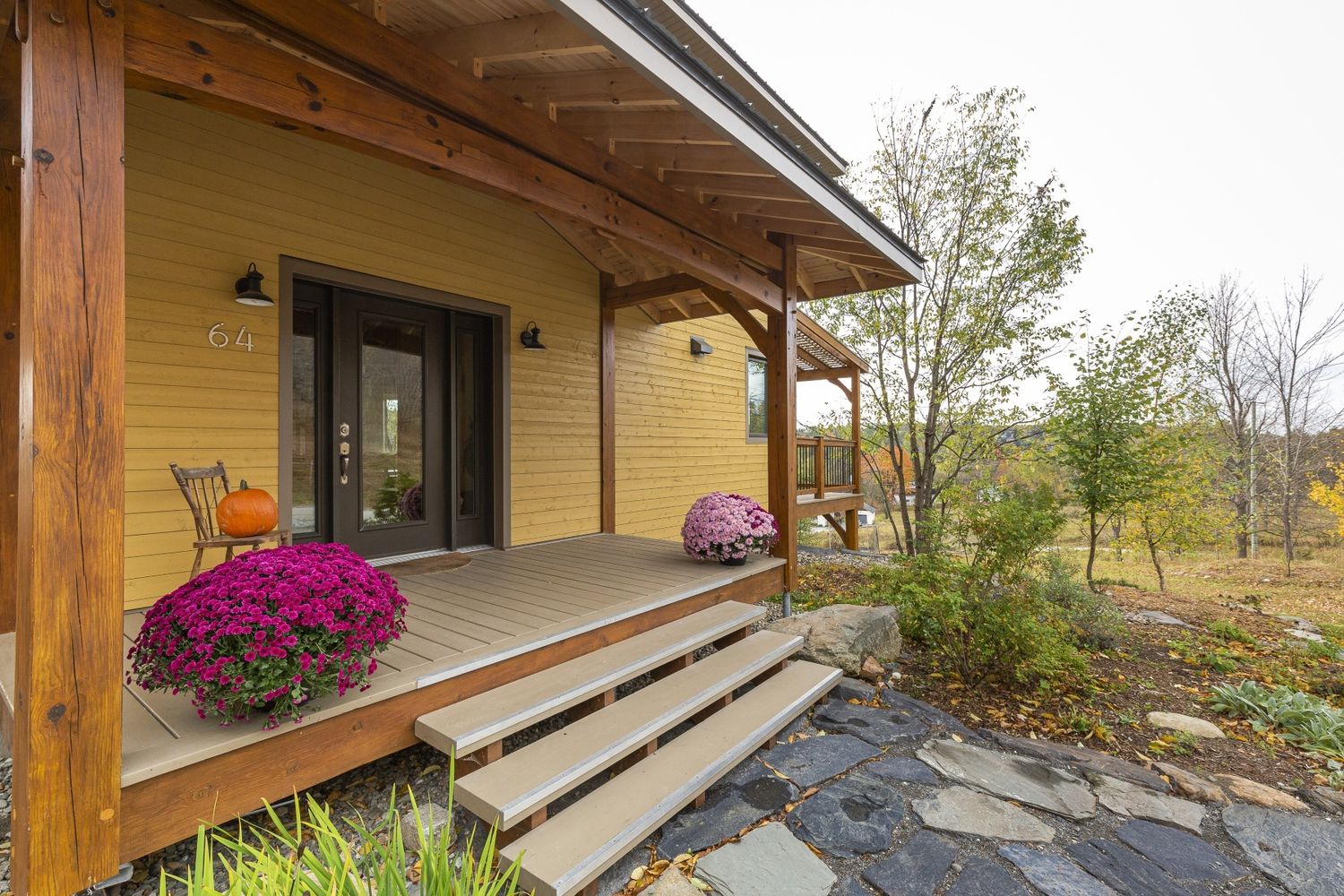 Sa remarquable structure en poutres et poteaux, réalisée par un artisan charpentier, est à l'honneur dans l'espace intérieur, donnant un cachet unique à la maison. La mezzanine et les aires de vie du premier étage sont lumineuses grâce à la fenestration abondante au sud. La terrasse côté sud, l'entrée de la maison et le garage ouvert sont agrémentés de structures en bois architecturales.