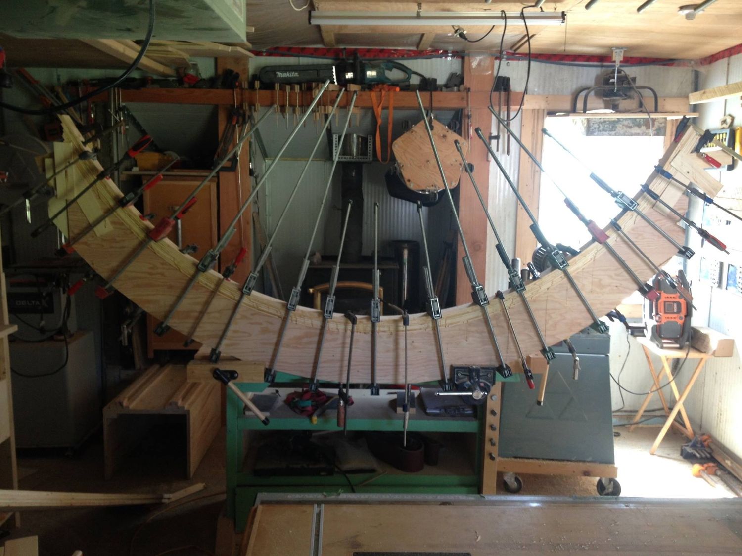 Balustre à l'étage , nez de marche du plancher et moulure de plafond laminés en lattes de bois cintrées sur gabarit