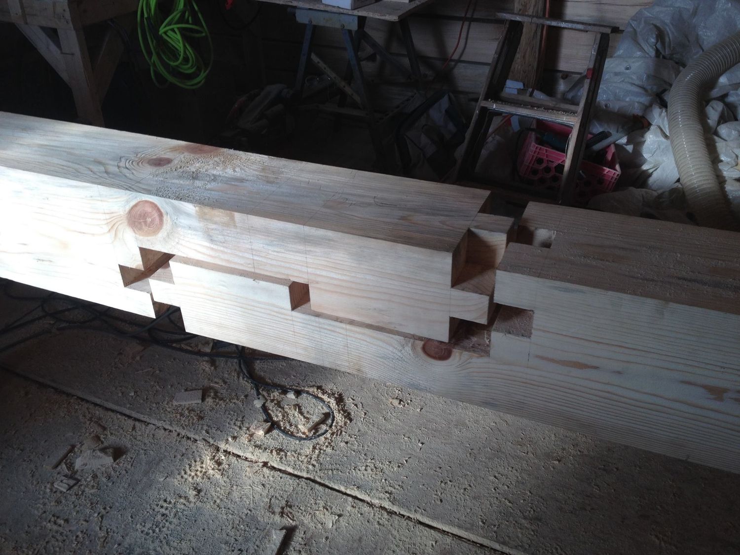Charpente de poutres et poteaux en pin rouge massif, fabriquée à la main avec patience et précision.