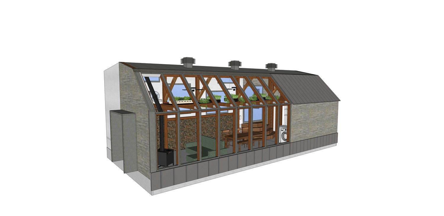 Le solarium est d’une superficie de 380 pi2 avec 65% de sa façade au sud de fenestré. Il a une longueur de 38 pi, une profondeur de 10 pi et 13 pi de hauteur. Le solarium est autoportant et est annexé à une petite maison sur roues. Cet espace évolutif et multifonctionnel a été conçu et construit par des membres de ALTE avec un budget d’environ 14 000$ en 75 jours de travail incluant la conception et la recherche des matériaux. Les matériaux tel que le bois local, les murs d’argile et le thermos recyclé, sont en grande majorité recyclés et biosourcés ce qui ajoute à la valeur écologique du projet. Plusieurs systèmes de gestion de l’environnement alternatifs ont été installés dans cet espace comme un système d’automatisation, un système de visualisation de plusieurs températures avec alarmes par texto, un plancher radiant à l’eau chaude, un système d’aérothermie (géothermie à air pulsé) et un système de ventilation naturelle par ventilateur passif.