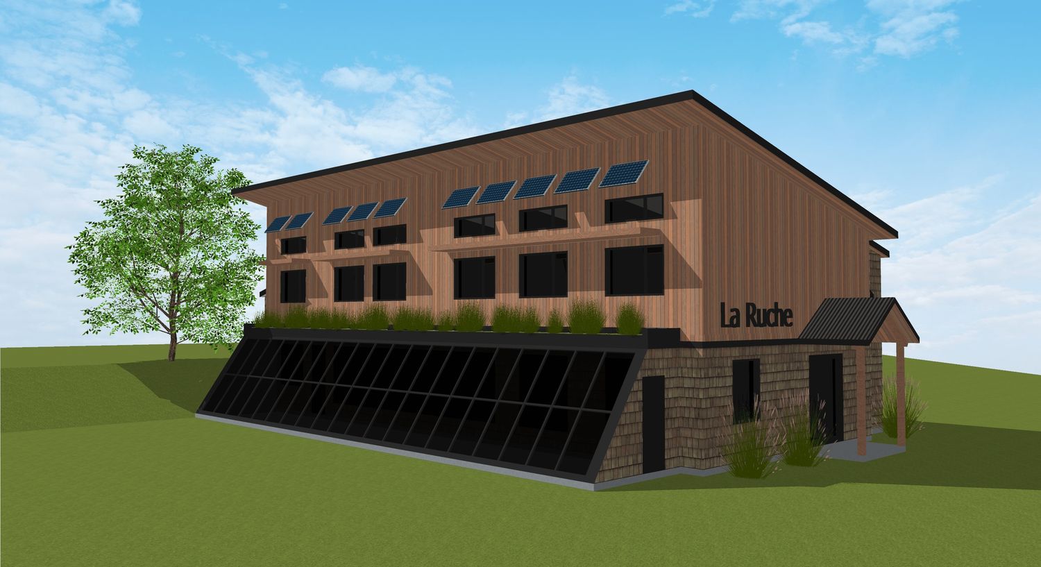 Autoconstruction d’une auberge comportant 6 chambres et une table champêtre pour une superficie d’environ 4000 pi² sur deux étages. Les clients souhaitaient faire l’usage de matériaux naturels, tel que l’isolation en chanvre ainsi que des fondations en bois. La conception devait reprendre plusieurs principes des bâtiments solaires passifs tel que l’ajout de masses thermiques et une serre solaire sur la façade sud.