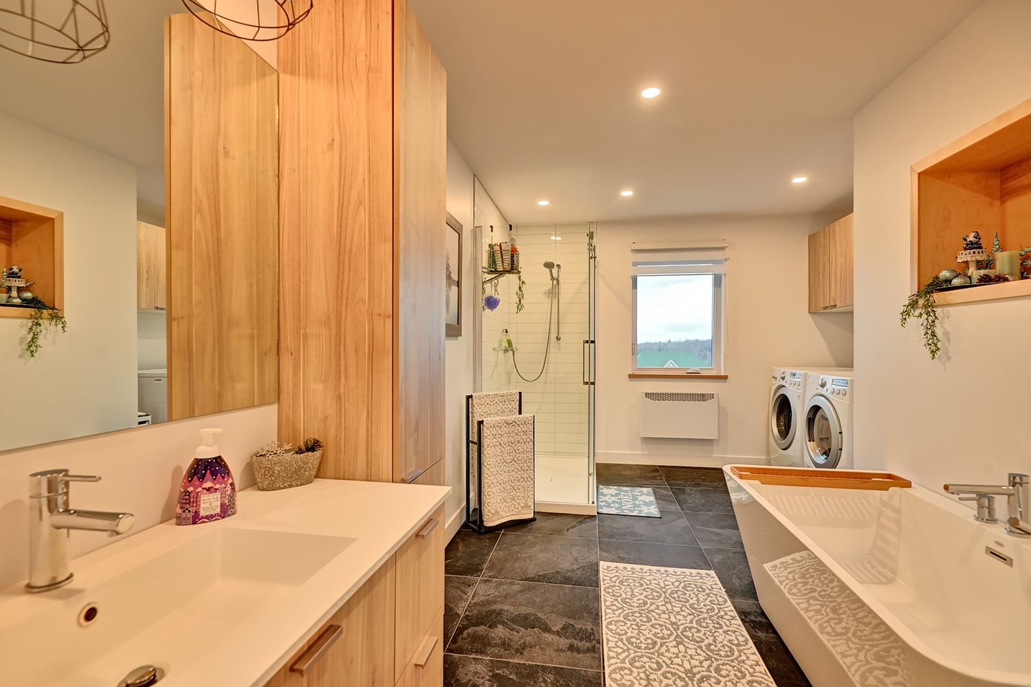 Bain autoportant, douche verre et céramique, plancher céramique, espace buanderie avec rangement. Recherches associées Salle de bain Sherbrooke (Estrie) Écoénergétique Intergénération École des Enfants de la Terre Propriété à revenu