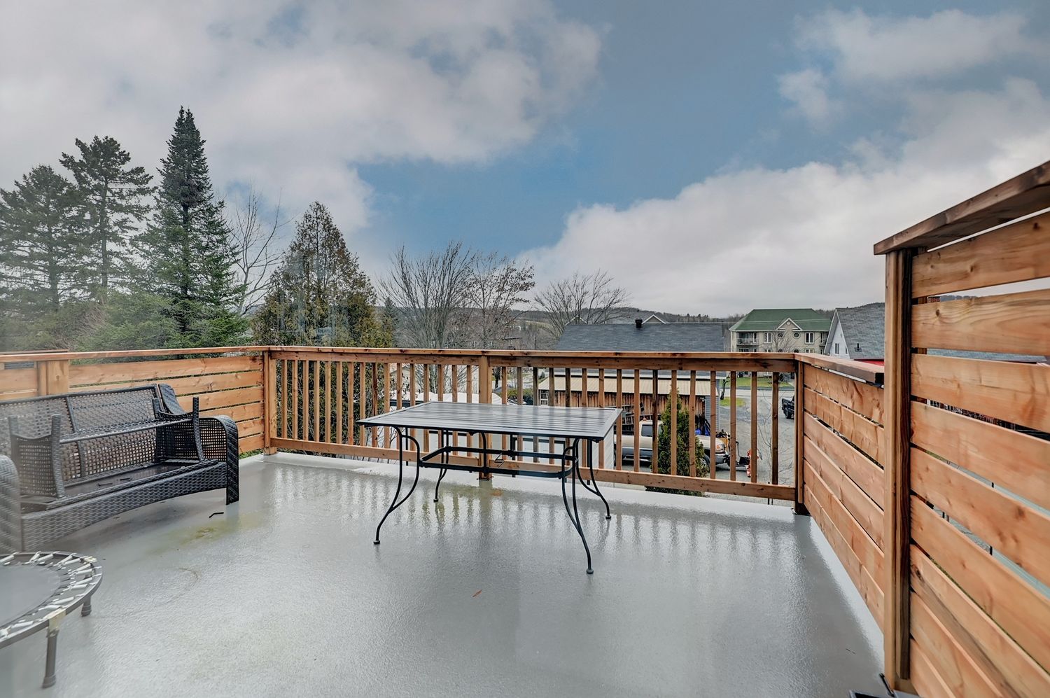 Grande terrasse 16' x 12', finition fibre de verre et mur intimité en bois. La terrasse sert de toit pour le patio du RDJ. Recherches associées Terrasse et balcon Sherbrooke (Estrie) Écoénergétique Intergénération École des Enfants de la Terre Propriété à revenu