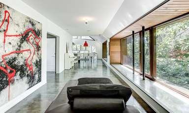 Une famille recomposée de 5 enfants dont les parents prévoient l’arrivée d’un 6e, un couple travaillant à mi-temps de la maison, un secteur animé d’une vie sociale tranquille et douce sont les prémices pour un projet de transformation et d’agrandissement de la petite maison entourée de ses arbres centenaires. Un nouveau volume de faible projection au sol se raccorde à l’existant qu’on a voulu conserver afin de minimiser l’empreinte carbone. Sa fenestration double hauteur laisser pénétrer la lumière du matin jusqu’au cœur de la maison existante, la cuisine familiale. Et pour rompre avec cette dualité extérieur-intérieur à laquelle nous confinent ces bâtiments hermétiques, les espaces intérieurs s’ouvrent jusqu’à créer des entre-deux et permettent cette souple transition des espaces communs vers l’extérieur. Les entre-deux nous protège des aléas climatiques mais nous permettent aussi de nous relier au Monde. Ce travail sur les transitions est renforcé par l’usage des revêtements en bois qui renforce cette liaison avec la nature environnante.