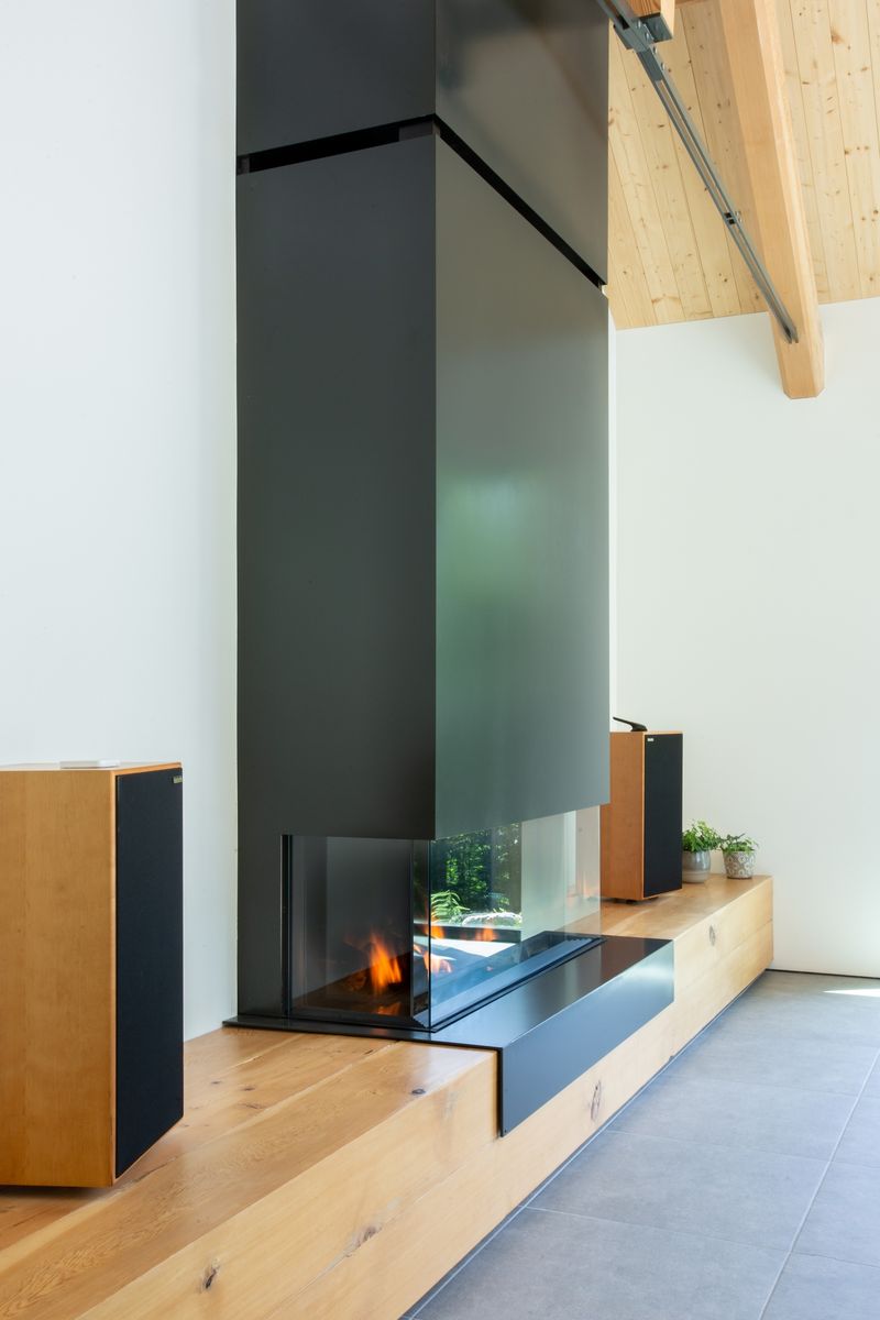 Les Trois Sommets est une réalisation de laquelle nous nous sentons particulièrement proche. Dès le premier contact, notre client avait déjà dans l’idée le rythme de trois pignons ouverts sur la forêt, en bâtiment plein pied. L’ajout du rez-de-jardin s’est fait naturellement durant la visite de terrain et à la suite du relevé topographique de celui-ci. Nous avons réalisé un plan qui se mariait parfaitement au profil du roc de la roche mère, une partie du cap de roche servant de seuil à la porte patio du rez-de-jardin. De plus, l’ajout de cet étage a permis de créer un espace d’écoute musicale sans fenêtres, rêvé par le client. La charpente en bois massif avec entraits d’acier a été réalisée par l’entreprise Conifère, dont le propriétaire est le fils de notre client. La fabrication de ces éléments demandait une grande précision, en plus de respecter les calculs d’un ingénieur en structure pour alléger l’ensemble structural et témoignent d’un travail exceptionnel. Cette maison unique et à l’image de nos clients est réalisée avec des matériaux nobles et durables, ainsi qu’un système de domotique intégré.