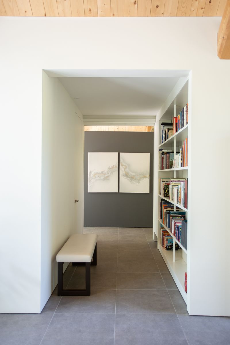 Les Trois Sommets est une réalisation de laquelle nous nous sentons particulièrement proche. Dès le premier contact, notre client avait déjà dans l’idée le rythme de trois pignons ouverts sur la forêt, en bâtiment plein pied. L’ajout du rez-de-jardin s’est fait naturellement durant la visite de terrain et à la suite du relevé topographique de celui-ci. Nous avons réalisé un plan qui se mariait parfaitement au profil du roc de la roche mère, une partie du cap de roche servant de seuil à la porte patio du rez-de-jardin. De plus, l’ajout de cet étage a permis de créer un espace d’écoute musicale sans fenêtres, rêvé par le client. La charpente en bois massif avec entraits d’acier a été réalisée par l’entreprise Conifère, dont le propriétaire est le fils de notre client. La fabrication de ces éléments demandait une grande précision, en plus de respecter les calculs d’un ingénieur en structure pour alléger l’ensemble structural et témoignent d’un travail exceptionnel. Cette maison unique et à l’image de nos clients est réalisée avec des matériaux nobles et durables, ainsi qu’un système de domotique intégré.