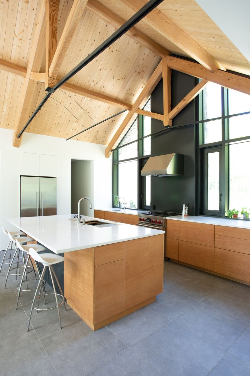 Les Trois Sommets est une réalisation de laquelle nous nous sentons particulièrement proche. Dès le premier contact, notre client avait déjà dans l’idée le rythme de trois pignons ouverts sur la forêt, en bâtiment plein pied. L’ajout du rez-de-jardin s’est fait naturellement durant la visite de terrain et à la suite du relevé topographique de celui-ci. Nous avons réalisé un plan qui se mariait parfaitement au profil du roc de la roche mère, une partie du cap de roche servant de seuil à la porte patio du rez-de-jardin. De plus, l’ajout de cet étage a permis de créer un espace d’écoute musicale sans fenêtres, rêvé par le client. La charpente en bois massif avec entraits d’acier a été réalisée par l’entreprise Conifère, dont le propriétaire est le fils de notre client. La fabrication de ces éléments demandait une grande précision, en plus de respecter les calculs d’un ingénieur en structure pour alléger l’ensemble structural et témoignent d’un travail exceptionnel. Cette maison unique et à l’image de nos clients est réalisée avec des matériaux nobles et durables, ainsi qu’un système de domotique intégré.