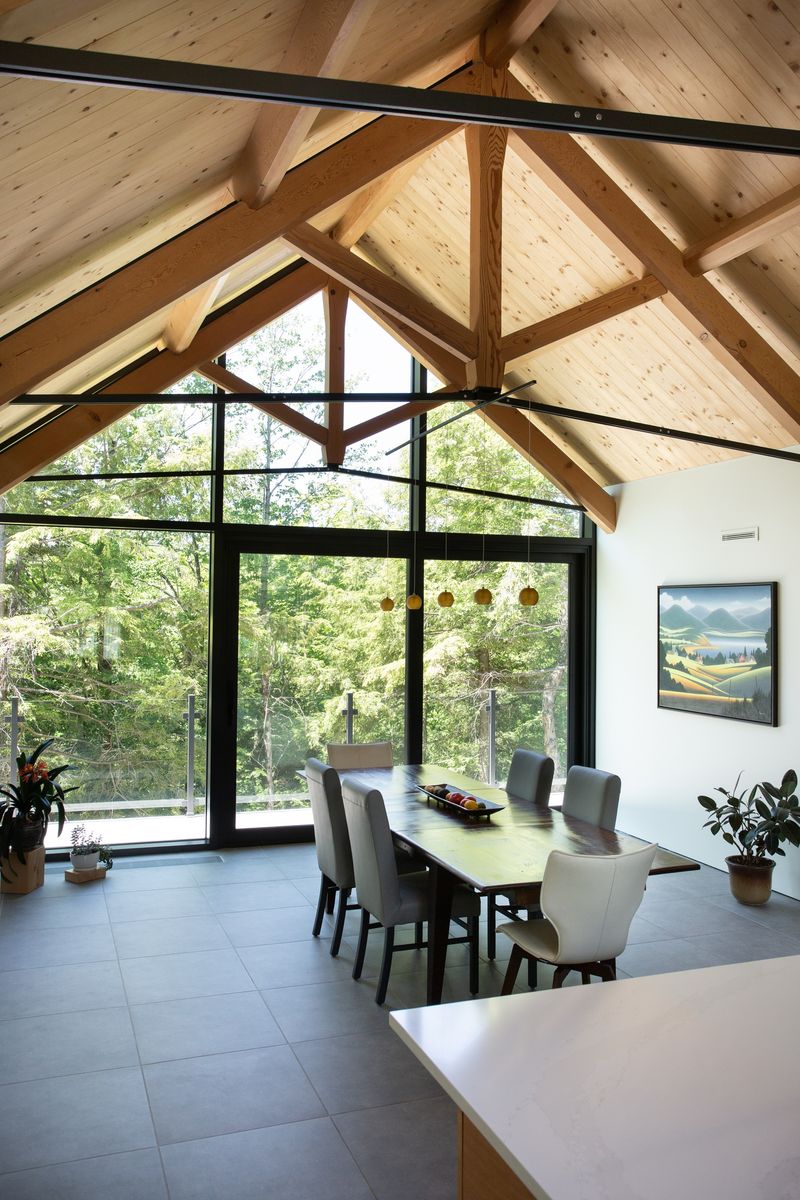 Les Trois Sommets est une réalisation de laquelle nous nous sentons particulièrement proche. Dès le premier contact, notre client avait déjà dans l’idée le rythme de trois pignons ouverts sur la forêt, en bâtiment plein pied. L’ajout du rez-de-jardin s’est fait naturellement durant la visite de terrain et à la suite du relevé topographique de celui-ci. Nous avons réalisé un plan qui se mariait parfaitement au profil du roc de la roche mère, une partie du cap de roche servant de seuil à la porte patio du rez-de-jardin. De plus, l’ajout de cet étage a permis de créer un espace d’écoute musicale sans fenêtres, rêvé par le client. La charpente en bois massif avec entraits d’acier a été réalisée par l’entreprise Conifère, dont le propriétaire est le fils de notre client. La fabrication de ces éléments demandait une grande précision, en plus de respecter les calculs d’un ingénieur en structure pour alléger l’ensemble structural et témoignent d’un travail exceptionnel. Cette maison unique et à l’image de nos clients est réalisée avec des matériaux nobles et durables, ainsi qu’un système de domotique intégré.