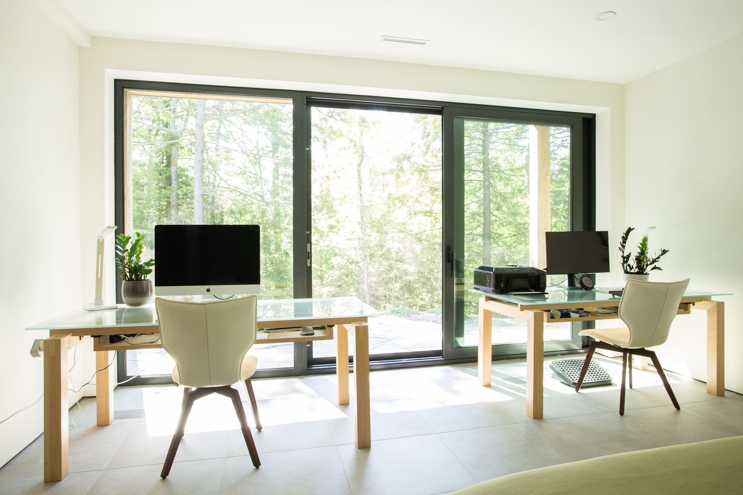 Les Trois Sommets est une réalisation de laquelle nous nous sentons particulièrement proche. Dès le premier contact, notre client avait déjà dans l’idée le rythme de trois pignons ouverts sur la forêt, en bâtiment plein pied. L’ajout du rez-de-jardin s’est fait naturellement durant la visite de terrain et à la suite du relevé topographique de celui-ci. Nous avons réalisé un plan qui se mariait parfaitement au profil du roc de la roche mère, une partie du cap de roche servant de seuil à la porte patio du rez-de-jardin. De plus, l’ajout de cet étage a permis de créer un espace d’écoute musicale sans fenêtres, rêvé par le client. La charpente en bois massif avec entraits d’acier a été réalisée par l’entreprise Conifère, dont le propriétaire est le fils de notre client. La fabrication de ces éléments demandait une grande précision, en plus de respecter les calculs d’un ingénieur en structure pour alléger l’ensemble structural et témoignent d’un travail exceptionnel. Cette maison unique et à l’image de nos clients est réalisée avec des matériaux nobles et durables, ainsi qu’un système de domotique intégré.