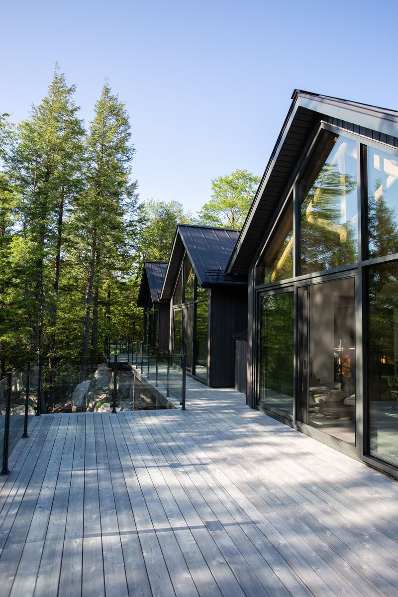 Les Trois Sommets est une réalisation de laquelle nous nous sentons particulièrement proche. Dès le premier contact, notre client avait déjà dans l’idée le rythme de trois pignons ouverts sur la forêt, en bâtiment plein pied. L’ajout du rez-de-jardin s’est fait naturellement durant la visite de terrain et à la suite du relevé topographique de celui-ci. Nous avons réalisé un plan qui se mariait parfaitement au profil du roc de la roche mère, une partie du cap de roche servant de seuil à la porte patio du rez-de-jardin. De plus, l’ajout de cet étage a permis de créer un espace d’écoute musicale sans fenêtres, rêvé par le client. La charpente en bois massif avec entraits d’acier a été réalisée par l’entreprise Conifère, dont le propriétaire est le fils de notre client. La fabrication de ces éléments demandait une grande précision, en plus de respecter les calculs d’un ingénieur en structure pour alléger l’ensemble structural et témoignent d’un travail exceptionnel. Cette maison unique et à l’image de nos clients est réalisée avec des matériaux nobles et durables, ainsi qu’un système de domotique intégré.