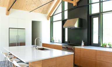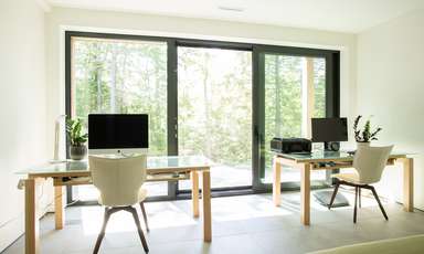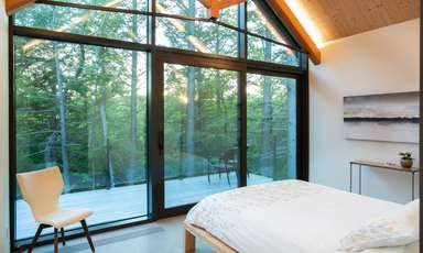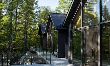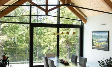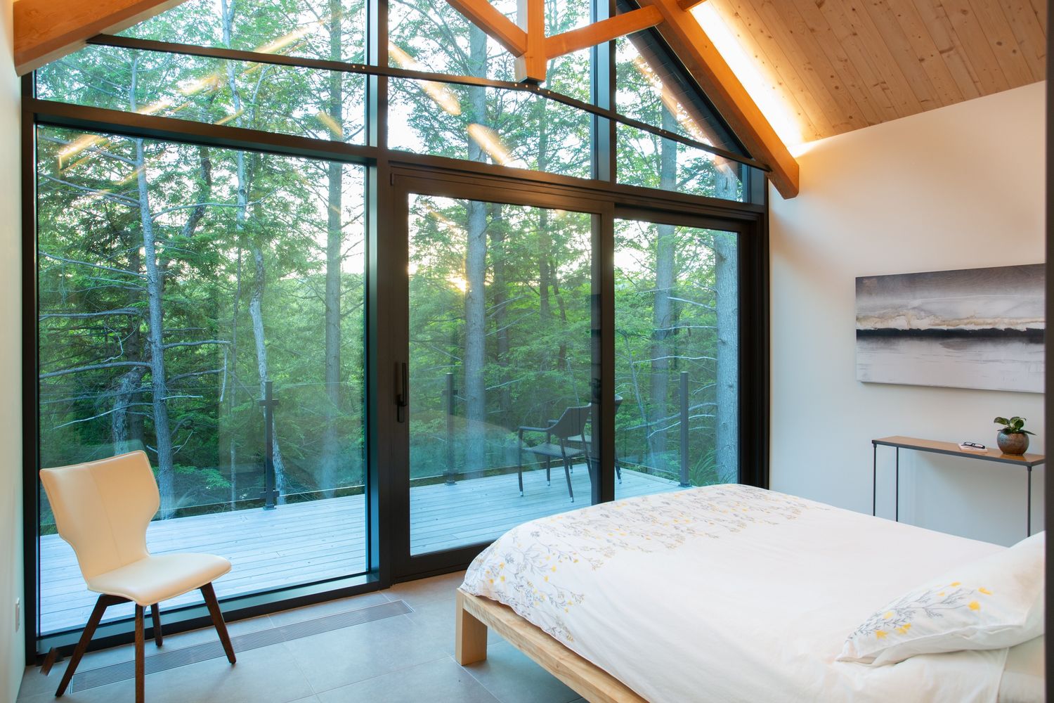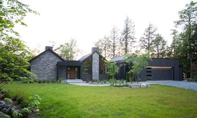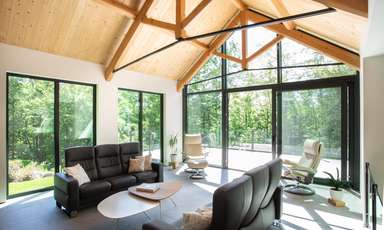 Les Trois Sommets est une réalisation de laquelle nous nous sentons particulièrement proche. Dès le premier contact, notre client avait déjà dans l’idée le rythme de trois pignons ouverts sur la forêt, en bâtiment plein pied. L’ajout du rez-de-jardin s’est fait naturellement durant la visite de terrain et à la suite du relevé topographique de celui-ci. Nous avons réalisé un plan qui se mariait parfaitement au profil du roc de la roche mère, une partie du cap de roche servant de seuil à la porte patio du rez-de-jardin. De plus, l’ajout de cet étage a permis de créer un espace d’écoute musicale sans fenêtres, rêvé par le client. La charpente en bois massif avec entraits d’acier a été réalisée par l’entreprise Conifère, dont le propriétaire est le fils de notre client. La fabrication de ces éléments demandait une grande précision, en plus de respecter les calculs d’un ingénieur en structure pour alléger l’ensemble structural et témoignent d’un travail exceptionnel. Cette maison unique et à l’image de nos clients est réalisée avec des matériaux nobles et durables, ainsi qu’un système de domotique intégré.