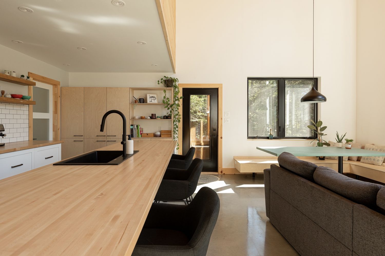 Cuisine et salle à manger à aire ouverte où la lumière naturelle et les matériaux nobles sont mis de l'avant. Recherches associées Cuisine Saint-Jérôme/Blainville (Laurentides) Scierie locale Val-Morin Maison fonctionnelle Solaire passif