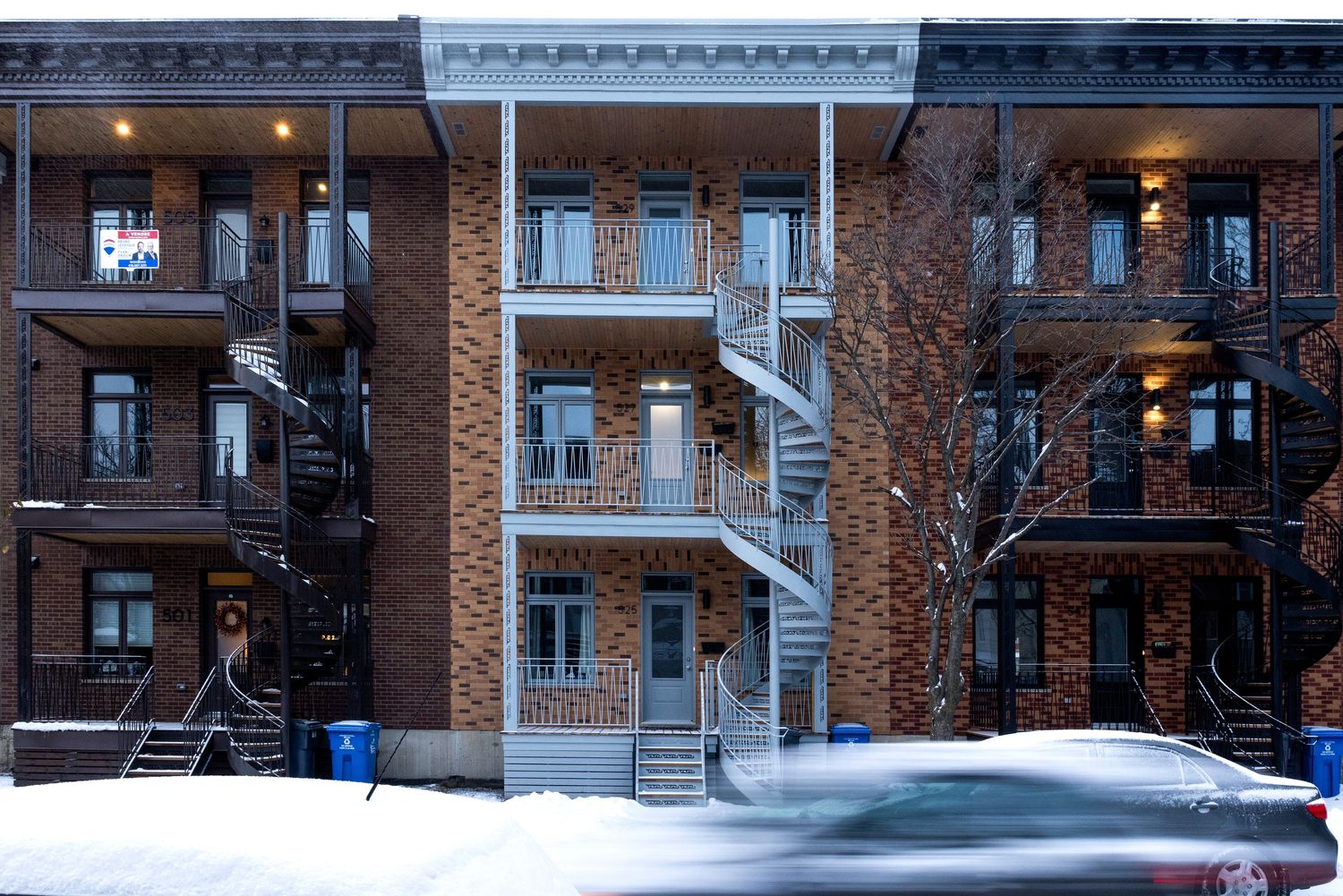 À l’image des immeubles patrimoniaux précédemment présents sur les sites, les triplex prennent la forme de cette typologie typique du quartier avec ses escaliers en colimaçon, ses balcons avant centrés en façade, ses métaux ouvrés détaillés et leur corniche. Les trois constructions similaires se distinguent par un assemblage de brique unique à chacun. Derrière, on aperçoit l’unicité du projet par le traitement des façades en revêtement d’acier léger qui sert à un moment de toiture aux terrasses et à d’autres, de mur d’intimité entre ces dernières. Bien que classique, la formule triplex a été modernisée au travers d’un plan qui profite au maximum du caractère traversant de ces typologies en utilisant toute la profondeur pour y mettre en file les aires de vie et en utilisant le mur mitoyen pour y disposer les chambres, séparées par la salle de bain. Chacune des unités du projet profite d’une très grande terrasse orientée nord-ouest afin de profiter amplement du soleil de fin de journée.