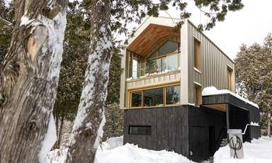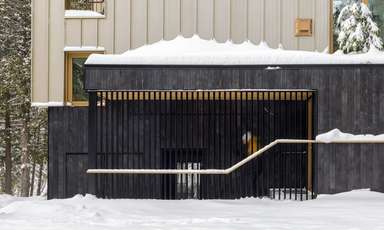 Les clients désiraient ajouter un étage afin de créer un espace pour la pratique du yoga avec vue sur le cours d’eau ainsi qu’une terrasse au toit pour y aménager un potager en bacs urbainculteurs, profitant de l’orientation favorable de la maison. Amateurs d’art, il était important pour eux de gagner de l’espace d’exposition pour leurs oeuvres ne pouvant être exposées dans la forme actuelle du bâtiment. Pour répondre à ces besoins, une extension latérale ainsi qu’un vestibule d’entrée se sont greffée à la résidence actuelle, couronnés d’un grand volume or afin de concrétiser l’idée de l’étage supplémentaire. Profitant maintenant d’une entrée centrale et à pallier, la résidence s’ouvre, dès les instants, sur toutes les étages, permettant aux visiteurs d’apprécier la grandeur du volume, mais également aux propriétaires d’y afficher leurs oeuvres de dimensions importantes. Le rez-de-chaussée, maintenant bonifié, s’ouvre sur la vue de la rivière tandis que le sous-sol sert maintenant de salle familiale ainsi que de rangement pour tous les articles de sport des clients. Pour se rendre à l’étage, on emprunte l’escalier monumental, créé de toute pièce pour la demeure, en acier perforé, peint de couleur or pour rappeler le geste à l’extérieur. À mi-parcours, une énorme fenêtre pleine hauteur baigne cet escalier de lumière, créant des jeux d’ombres sur les murs et donne accès à la toiture verte recouvrant le volume d’entrée. À l’étage, la circulation s’ouvre sur une grande porte patio donnant accès à la terrasse en toiture et la pièce au toit cathédrale cadre la vue vers le marais, à l’ouest de la rivière. Enfin, le revêtement existant de la résidence a entièrement été remplacé par un revêtement de cèdre brûlé donnant de la texture et cet aspect réfléchissant au bois.