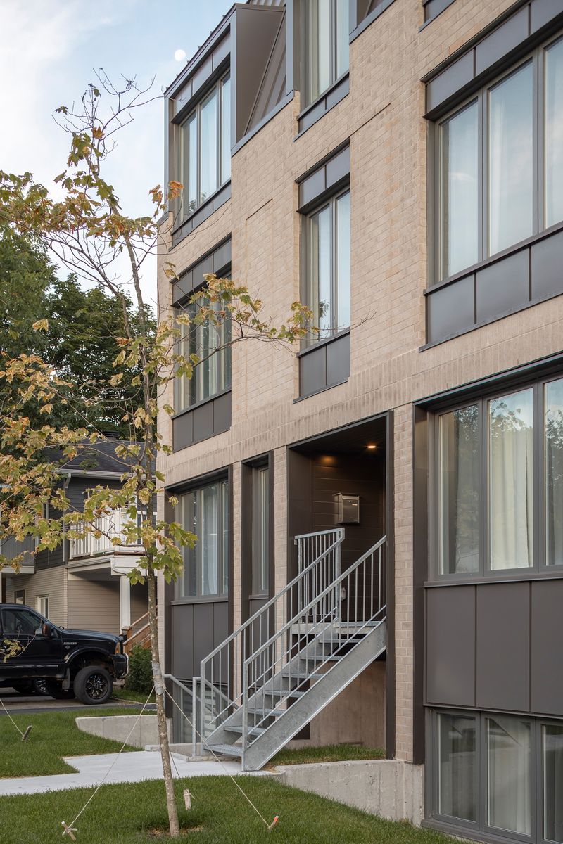 Composé de quatre niveaux, le projet s’inspire des voisins pour s’intégrer dans le secteur. En volumétrie, les proportions et le toit mansardé rappellent le gabarit résidentiel détaché du voisinage. En façade, Joséphine est revêtue d’une matérialité aux couleurs sobres, dans les mêmes tons que la petite maison qui se trouvait sur le site auparavant. Les entrées partagées quant à elles, sont marquées par un revêtement métallique coloré en plus d’être positionnées en retrait par rapport à la façade avant. À l’intérieur, tous les logements sont traversants pour permettre aux occupants de profiter de la lumière et de la ventilation naturelle. Le projet offre aussi un balcon partagé par étages ainsi qu’une cour extérieure commune. Enfin, Joséphine permet de vivre en ville à proximité du futur projet de transport collectif de tramway à Québec.