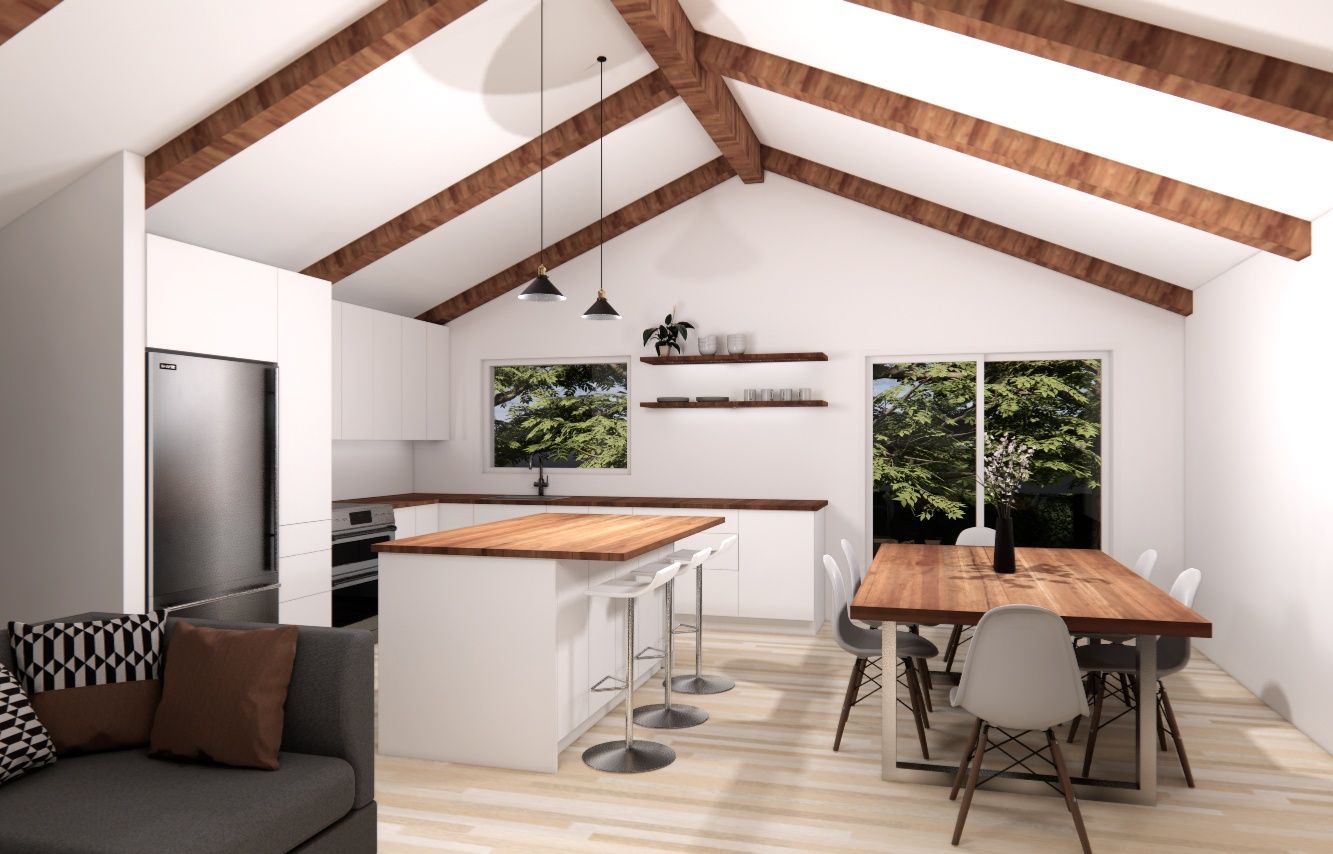 - Démolition complète du toit pour avoir un plafond cathédrale à l’intérieur et avoir plus de hauteur de plafond dans la cuisine/salle à manger/salon