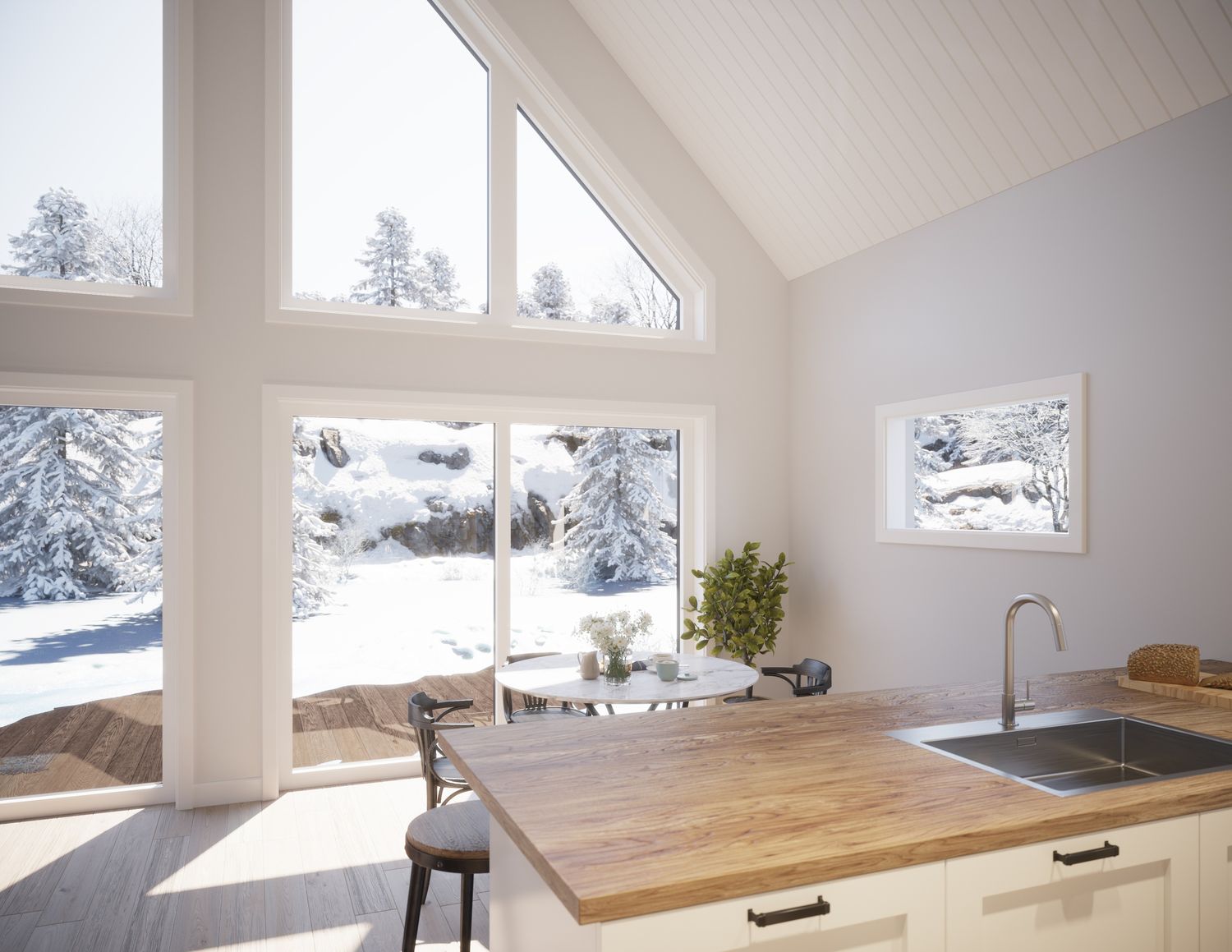 Le modèle HÖST-4 offre 1472 pieds carrés avec un sous-sol et un rez-de-chaussée. Cette maison lumineuse propose quatre chambres et deux salles de bains mais surtout une magnifique fenestration avec une vue imprenable sur la nature. Cette conception écologique et saine de style scandinave est disponible en version rez-de-jardin (image de représentation).