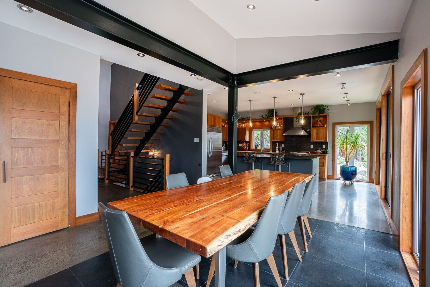 Voici un exemple de projet qui a vieilli bien dans le temps. Cette maison construite en 2010 nous montre bien la mentalité de la construction durable. Après plus de 10 ans, cette maison reste parfaitement au goût du jour. Située en sommet de montagne avec une exposition franc sud, elle reflète bien le design solaire passif. Les clients ont opté pour des finitions en bois naturel, une cuisine en cerisier, des meubles de salle de bain en noyer, sans compter le magnifique escalier central avec le jeu de poutre en acier. La vue y est à couper le souffle.