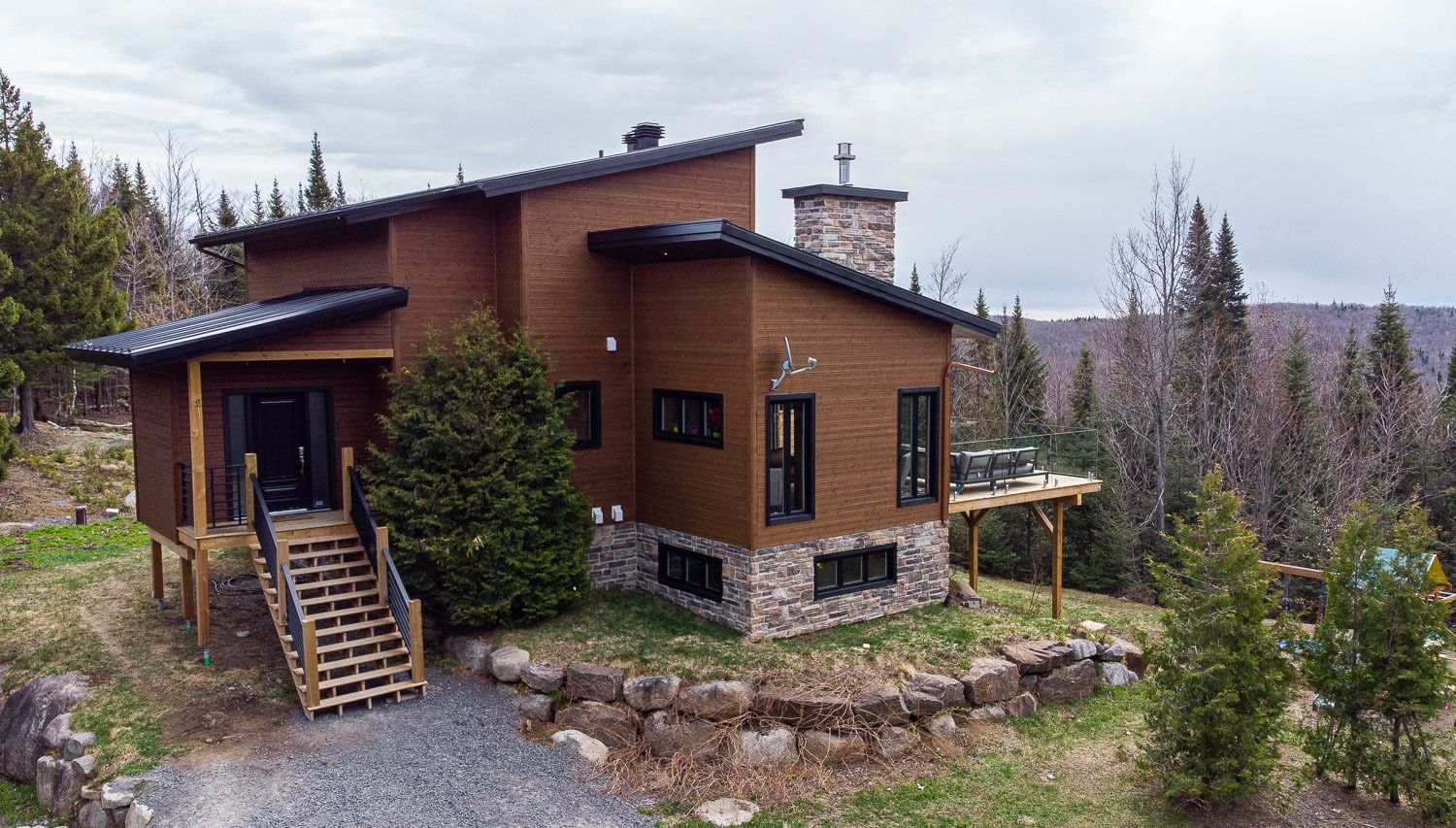 Voici un exemple de projet qui a vieilli bien dans le temps. Cette maison construite en 2010 nous montre bien la mentalité de la construction durable. Après plus de 10 ans, cette maison reste parfaitement au goût du jour. Située en sommet de montagne avec une exposition franc sud, elle reflète bien le design solaire passif. Les clients ont opté pour des finitions en bois naturel, une cuisine en cerisier, des meubles de salle de bain en noyer, sans compter le magnifique escalier central avec le jeu de poutre en acier. La vue y est à couper le souffle.