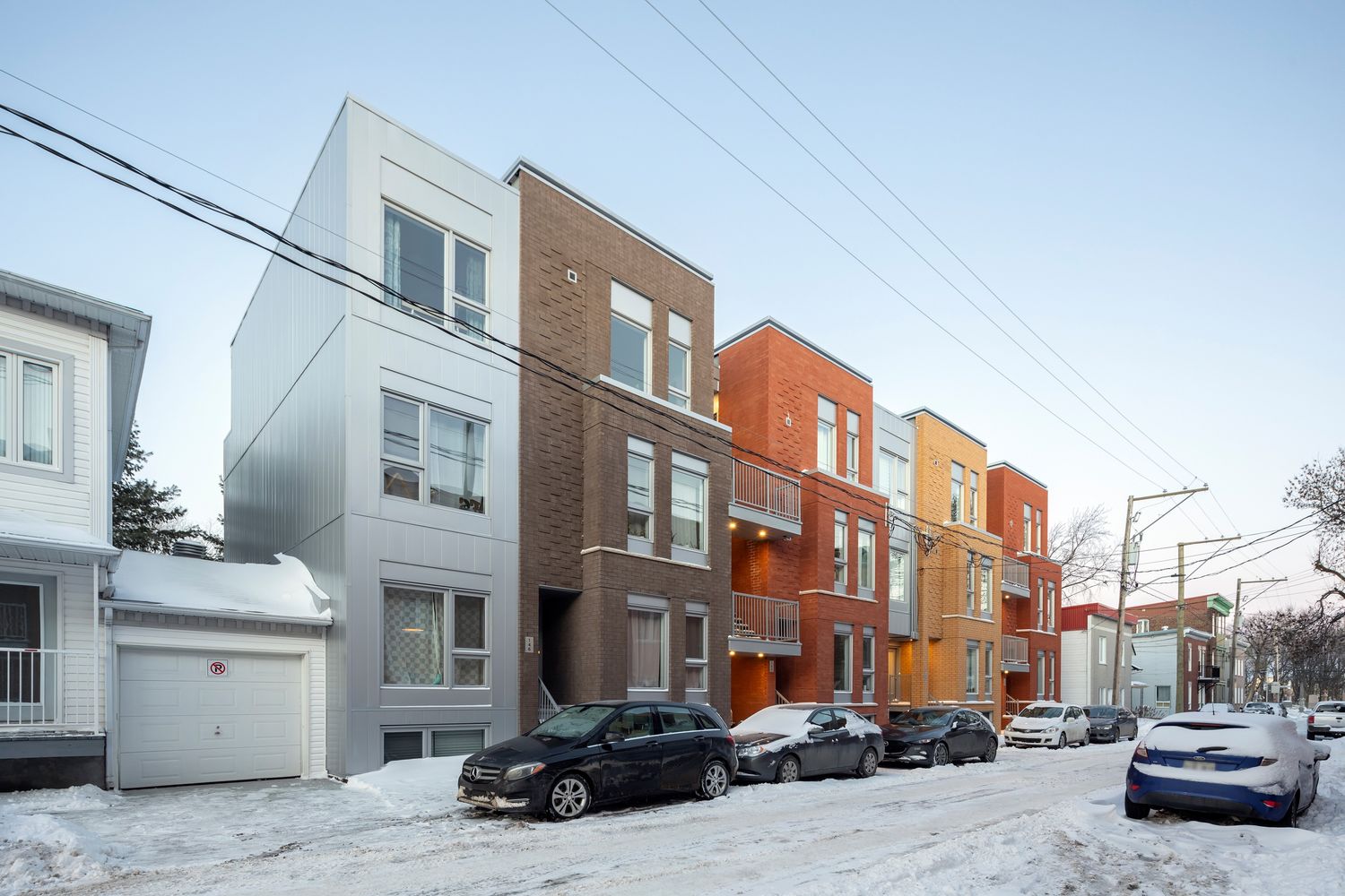 Charles est situé à proximité du parc linéaire de la rivière Saint-Charles dans le quartier Saint-Sauveur. Il regroupe à la fois de grandes unités sur deux niveaux et plusieurs traversantes aux étages supérieurs qui s’ouvrent sur des terrasses généreuses à l’arrière. Charles exprime son individualité dans un contexte urbain hétéroclite et disparate. Les quatre volumes de maçonnerie aux couleurs contrastantes, habilement morcelés pour réduire leur impact sur rue et sculptés avec un jeu de brique en avancée, sont entrecoupés par d’étroits retraits de parement léger dans lesquels les circulations verticales et la porte cochère viennent se glisser. Les escaliers extérieurs en métal architectural, rehaussés par des bacs de plantation et des filtres végétaux, distribuent les entrées des logements en retrait de la rue pour assurer l’intimité des occupants. En façade, le rythme régulier et les proportions des fenêtres plus traditionnelles tranchent avec la composition contemporaine du jeu de pleins et de vides évoqués par la matérialité.