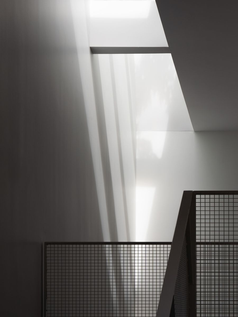 Au rez-de-chaussée, situé en contrebas et accessible depuis l’entrée par des gradins de béton et de bois, se trouvent les espaces privés. La lumière naturelle provenant de l’étage au-dessus est filtrée à travers une passerelle ajourée venant ainsi éclairer la circulation vers les chambres. La chambre principale, affichant la charpente en bois, est baignée d’une lumière diffuse provenant d’une grande baie vitrée donnant sur une courette privée.
