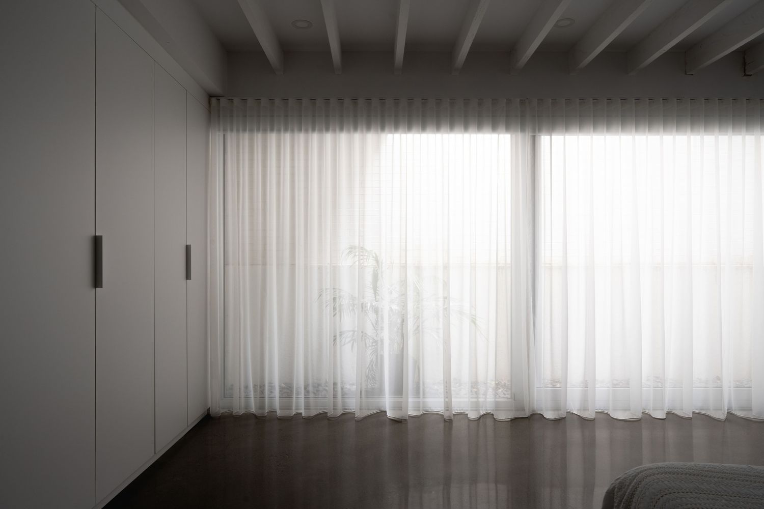 Au rez-de-chaussée, situé en contrebas et accessible depuis l’entrée par des gradins de béton et de bois, se trouvent les espaces privés. La lumière naturelle provenant de l’étage au-dessus est filtrée à travers une passerelle ajourée venant ainsi éclairer la circulation vers les chambres. La chambre principale, affichant la charpente en bois, est baignée d’une lumière diffuse provenant d’une grande baie vitrée donnant sur une courette privée.