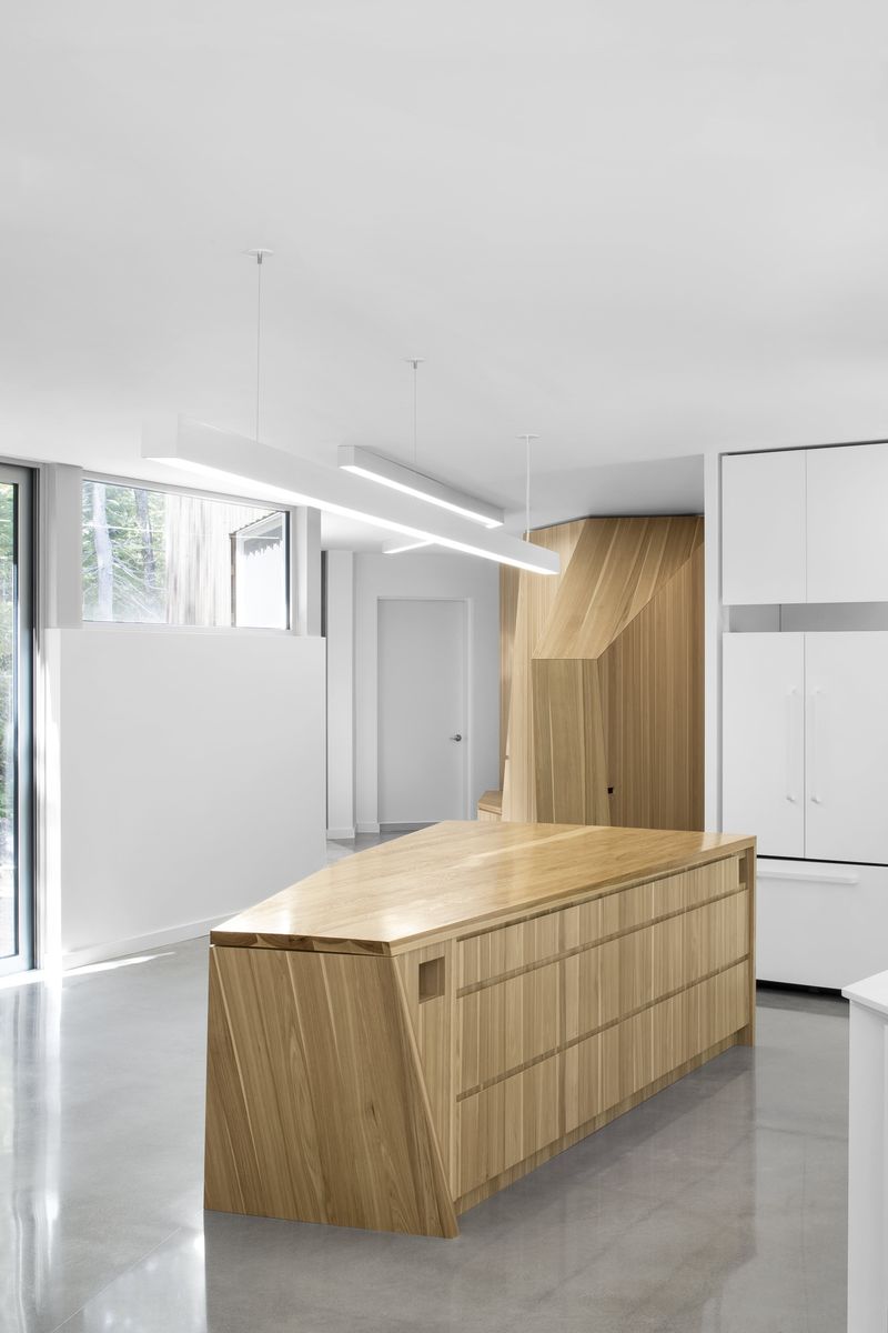 Dès l’entrée, un meuble imposant en bois de caryer (hickory) nous accueille. Sa forme nous offre un endroit pour s’asseoir et du rangement pour nos manteaux. Elle nous redirige aussi vers l’aire de vie, un grand espace lumineux qui culmine à son extrémité par une pièce grillagée en porte-à-faux. Sur le côté sud, le mur extérieur disparaît et devient une grande surface vitrée s’ouvrant sur la forêt. Les matières utilisées pour les surfaces sont simples et épurées; des murs blancs et un plancher de béton poli qui contrastent avec la nature sauvage environnante et lui laisse toute la place pour s’exprimer.