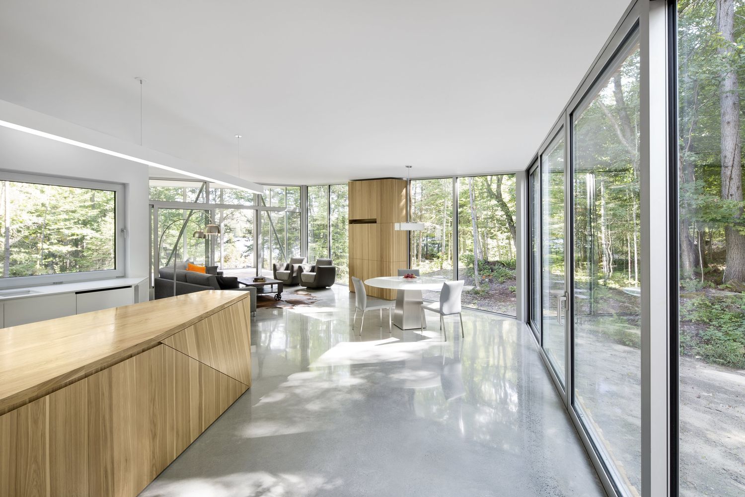 Dès l’entrée, un meuble imposant en bois de caryer (hickory) nous accueille. Sa forme nous offre un endroit pour s’asseoir et du rangement pour nos manteaux. Elle nous redirige aussi vers l’aire de vie, un grand espace lumineux qui culmine à son extrémité par une pièce grillagée en porte-à-faux. Sur le côté sud, le mur extérieur disparaît et devient une grande surface vitrée s’ouvrant sur la forêt. Les matières utilisées pour les surfaces sont simples et épurées; des murs blancs et un plancher de béton poli qui contrastent avec la nature sauvage environnante et lui laisse toute la place pour s’exprimer.