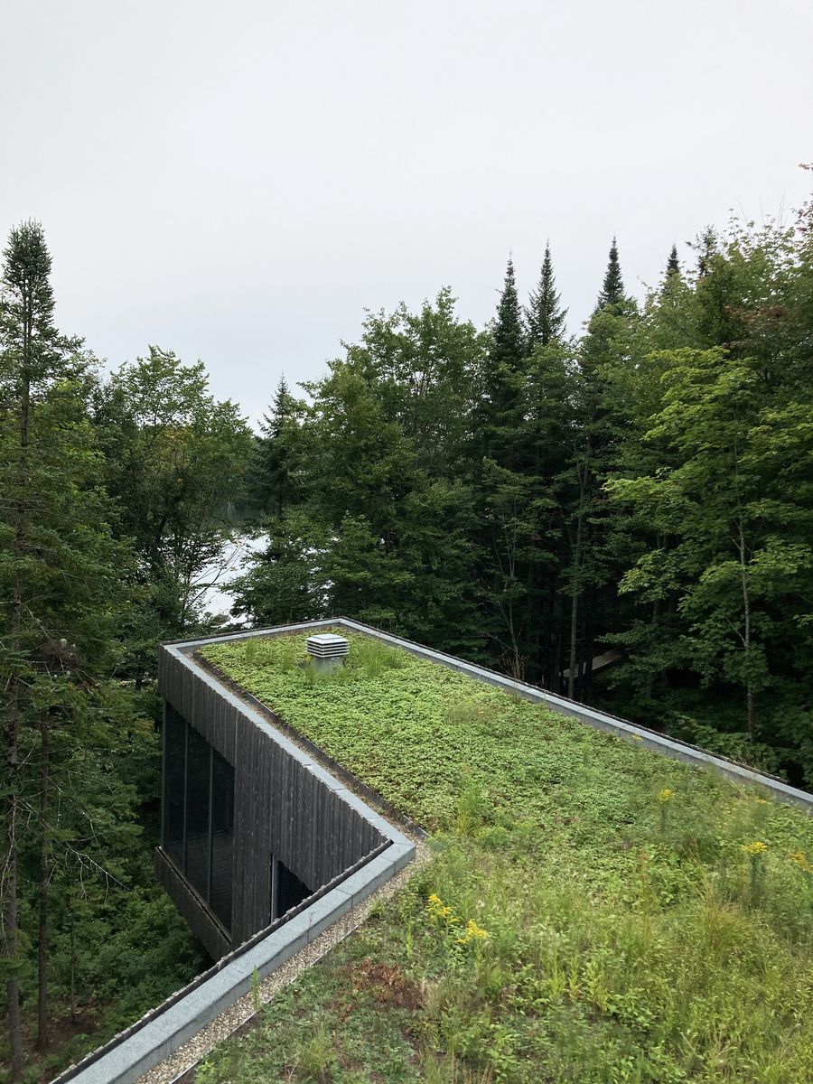 Dès l’entrée, un meuble imposant en bois de caryer (hickory) nous accueille. Sa forme nous offre un endroit pour s’asseoir et du rangement pour nos manteaux. Elle nous redirige aussi vers l’aire de vie, un grand espace lumineux qui culmine à son extrémité par une pièce grillagée en porte-à-faux. Sur le côté sud, le mur extérieur disparaît et devient une grande surface vitrée s’ouvrant sur la forêt. Les matières utilisées pour les surfaces sont simples et épurées; des murs blancs et un plancher de béton poli qui contrastent avec la nature sauvage environnante et lui laisse toute la place pour s’exprimer.