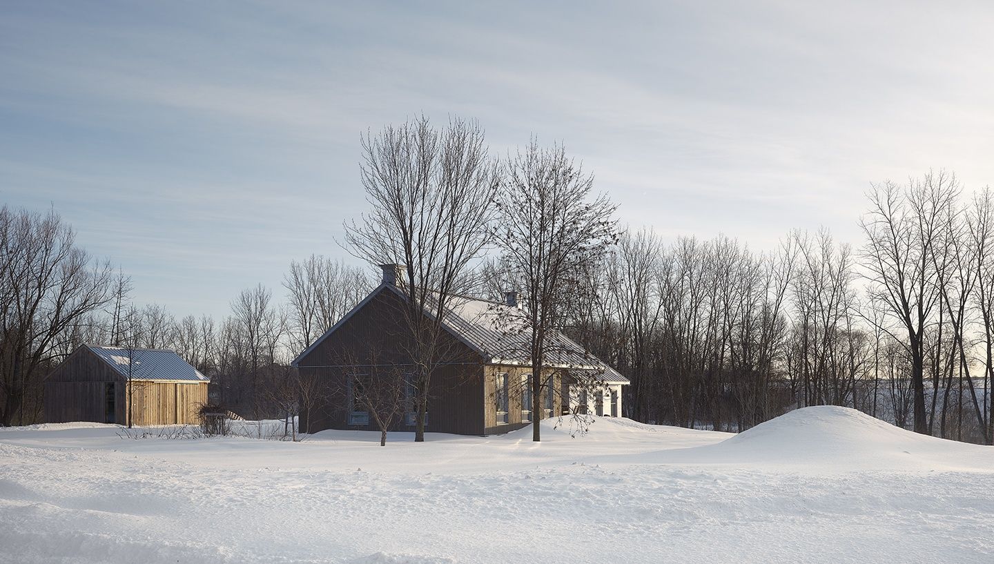Nous avons conçu le projet en puisant notre inspiration dans le riche tissu pavillonnaire et villageois de la région de St-Denis-sur-Richelieu, qui abrite de magnifiques maisons patrimoniales pleines de caractère. Notre intention était de créer un habitat unique qui s'intègre harmonieusement dans son environnement, en respectant le patrimoine architectural existant. Nous avons incorporé et réinterprété des éléments singuliers et représentatifs de ce contexte, tels que les cheminées au toit et les jeux de volumes. La conception architecturale des volumes s'inspire des anciennes maisons environnantes, en privilégiant la sobriété par la symétrie et la séparation fonctionnelle. Un volume bas et délicat accueille les espaces de nuit, tandis qu'un volume plus haut et prédominant démarque les espaces de vie. L'entrée se situe au cœur de la maison, permettant une transversalité d'avant en arrière.