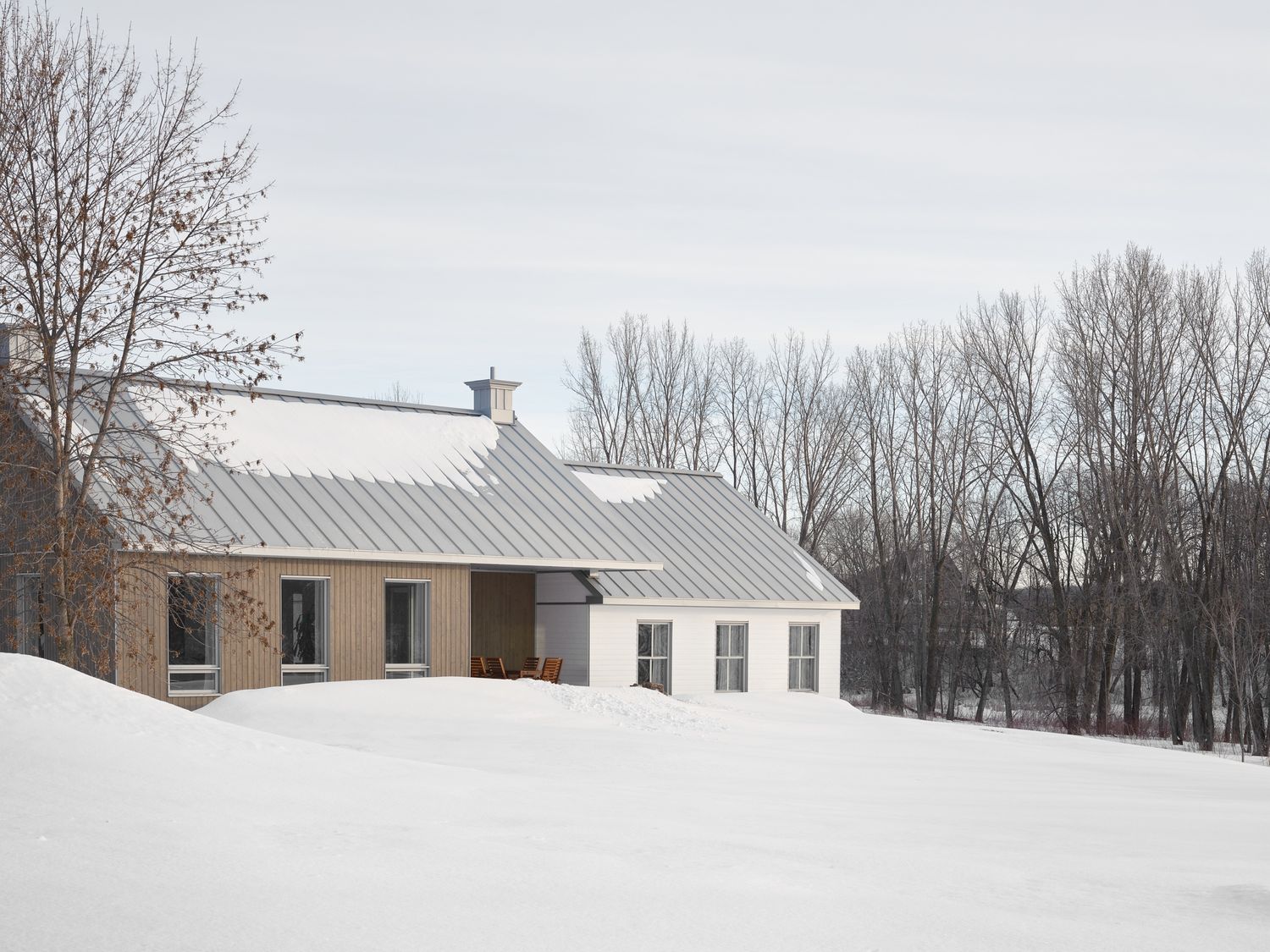 Nous avons conçu le projet en puisant notre inspiration dans le riche tissu pavillonnaire et villageois de la région de St-Denis-sur-Richelieu, qui abrite de magnifiques maisons patrimoniales pleines de caractère. Notre intention était de créer un habitat unique qui s'intègre harmonieusement dans son environnement, en respectant le patrimoine architectural existant. Nous avons incorporé et réinterprété des éléments singuliers et représentatifs de ce contexte, tels que les cheminées au toit et les jeux de volumes. La conception architecturale des volumes s'inspire des anciennes maisons environnantes, en privilégiant la sobriété par la symétrie et la séparation fonctionnelle. Un volume bas et délicat accueille les espaces de nuit, tandis qu'un volume plus haut et prédominant démarque les espaces de vie. L'entrée se situe au cœur de la maison, permettant une transversalité d'avant en arrière.
