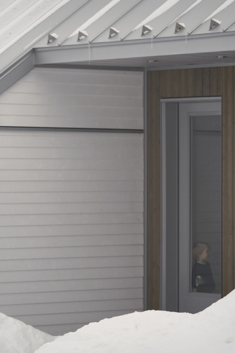 Nous avons conçu le projet en puisant notre inspiration dans le riche tissu pavillonnaire et villageois de la région de St-Denis-sur-Richelieu, qui abrite de magnifiques maisons patrimoniales pleines de caractère. Notre intention était de créer un habitat unique qui s'intègre harmonieusement dans son environnement, en respectant le patrimoine architectural existant. Nous avons incorporé et réinterprété des éléments singuliers et représentatifs de ce contexte, tels que les cheminées au toit et les jeux de volumes. La conception architecturale des volumes s'inspire des anciennes maisons environnantes, en privilégiant la sobriété par la symétrie et la séparation fonctionnelle. Un volume bas et délicat accueille les espaces de nuit, tandis qu'un volume plus haut et prédominant démarque les espaces de vie. L'entrée se situe au cœur de la maison, permettant une transversalité d'avant en arrière.