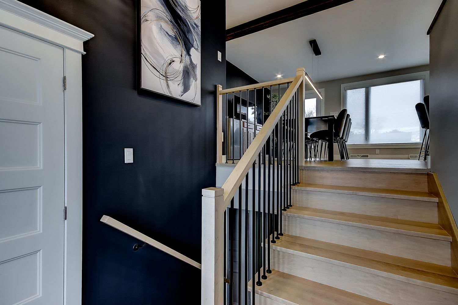 Nous avons modifier la totalité de l'aménagemnt des aires de vie de cette maison de style "split-level" en interchangeant la cuisine et la salle à manger et en ouvrant tout le mur séparant la cuisine du reste des aires de vie.  Le changmeent de toutes les fenêtre à permis aussi de rendre la maison plus performante énergéitquement parlant.