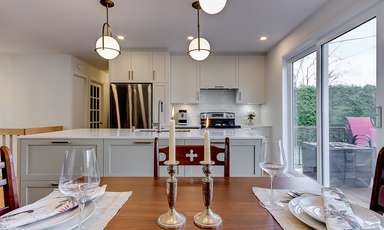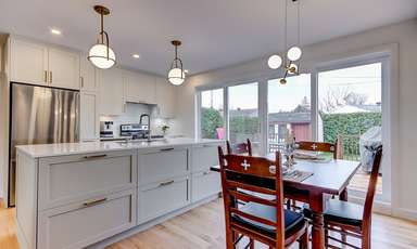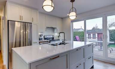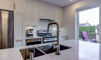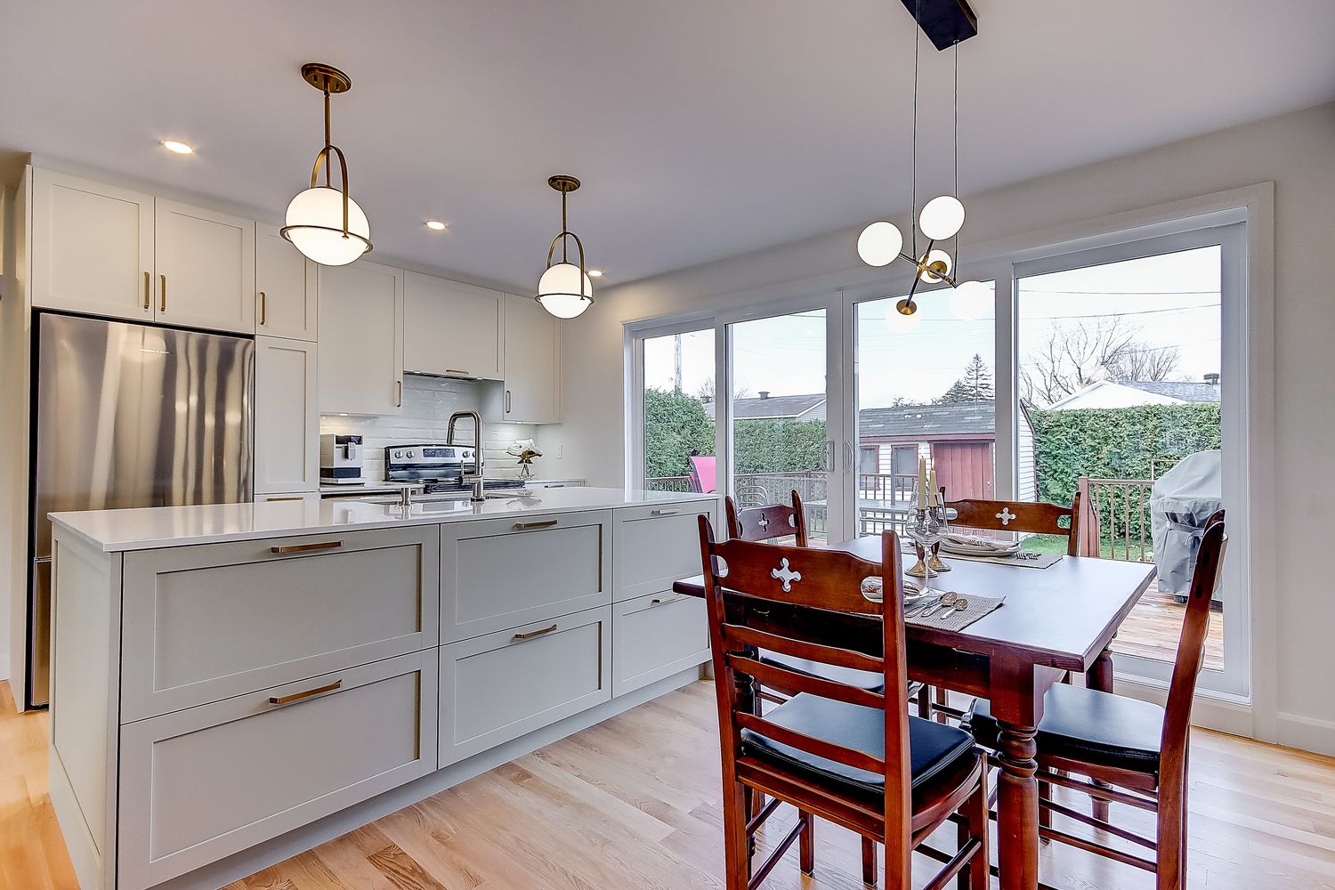 Les cloisons séparant la cuisine, la salle à manger et le salon de cette maison de type "split-level" ont tous été enlevées afin d'optimiser l'espace mais aussi donner plus de luminosité aux pièces à vivre.  En plus, la porte-patio arrière a été remplacée mais surtout agrandie (en utilisant l'espace de l'ancienne petite fenêtre aussi) afin d'augmenter la luminosité et être beaucoup plus énergétique que l'ancienne.  Du même coup. l'isolation du mur arrière de cette maison (datant des années '70) à été refait au complet.  Aidant grandement le chauffage et la climatisation de la maison.