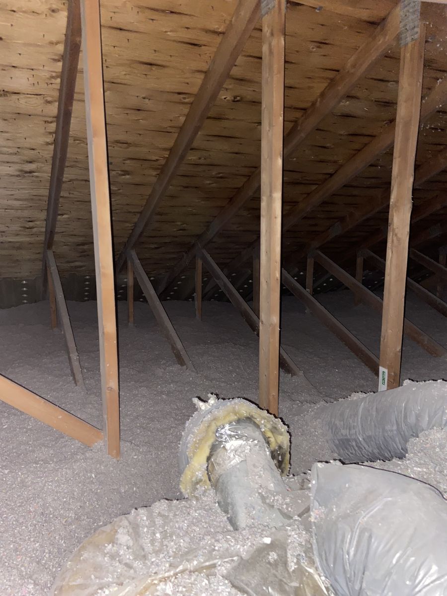 Nous avons décontaminé la charpente de toit à l'aide d'un traitement anti fongique. Par la suite nous avons bien dégagé les soffites et installé des styro vent pour assurer une bonne ventilation dans le grenier. Finalement, nous avons ajouté un 12'' de cellulose soufflé pour obtenir une valeur de R-51 et nous avons isolé adéquatement la trappe d'accès de l'entretoit.