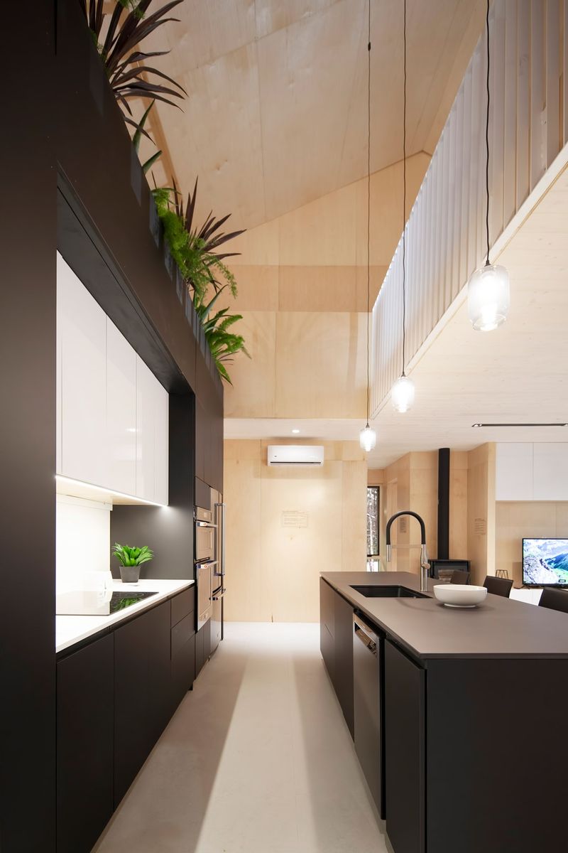 Vue de la cuisine en double hauteur de l'Éco-Habitat S1600