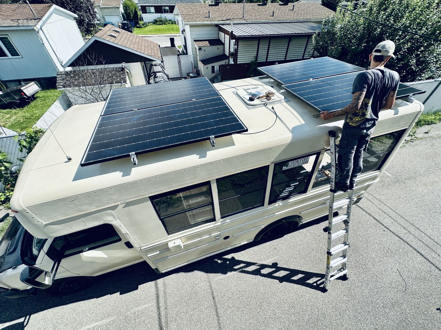 Réalisation d'un système électrique autonome en énergie solaire. Montage sur le toit du bus de 4 panneaux de 340 Watts pour un total de 1360 Watts de potentielle PV. Ajout branchement pour raccord avec l'alternateur du véhicule pour avoir deux sources différentes d'alimentation. Conception et montage en atelier du système électrique. Installation du système électrique avec entre autre: - 2 batteries Lithium de 100 Amp/48 Volts avec système de communication bluetooth - Onduleur chargeur Multiplus II - 3000 Watts - Cerbo GX *Projet en collaboration avec WattOSoleil !