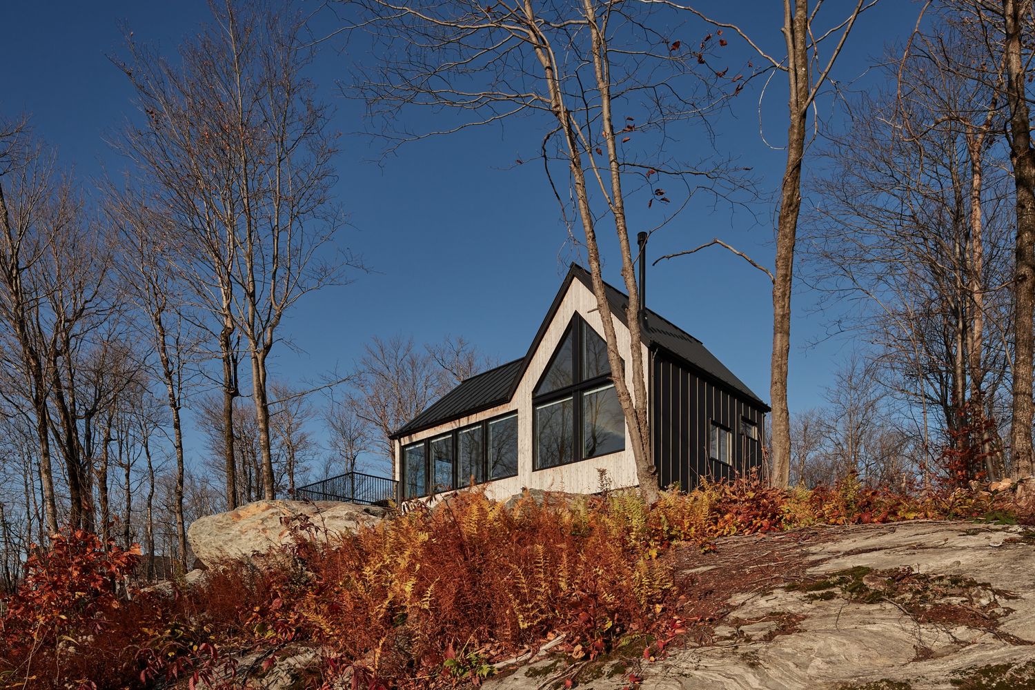 Conçu pour s'intégrer harmonieusement à son environnement, le chalet Les Cousins ne cherche pas à dominer le paysage, mais plutôt à en faire partie. Les matériaux choisis, ainsi que la conception globale du bâtiment, ont été pensés pour s'harmoniser avec la beauté naturelle de l'Estrie. L'emploi du béton brut, en écho aux formations rocheuses du mont Bolton, montre un profond respect pour le cadre naturel tout en ajoutant une touche contemporaine. Chaque espace de ce chalet a été conçu pour optimiser le confort et l'expérience des résidents et invités. Dès l'entrée dans le chalet, la généreuse fenestration sert de cadre panoramique à l'horizon montagneux et aux lacs sereins de l'Estrie. Les levers et couchers de soleil offrent un spectacle quotidien, chaque saison apportant sa propre palette de couleurs vibrantes. Les trois chambres, bien qu'intimement connectées à la nature par leurs vues, offrent chacune une sensation unique, garantissant que chaque visiteur trouve un espace qui lui ressemble. Le hamac en mezzanine, au-delà de son rôle de relaxation, joue astucieusement avec la lumière naturelle, créant un espace accueillant dès le seuil franchi.