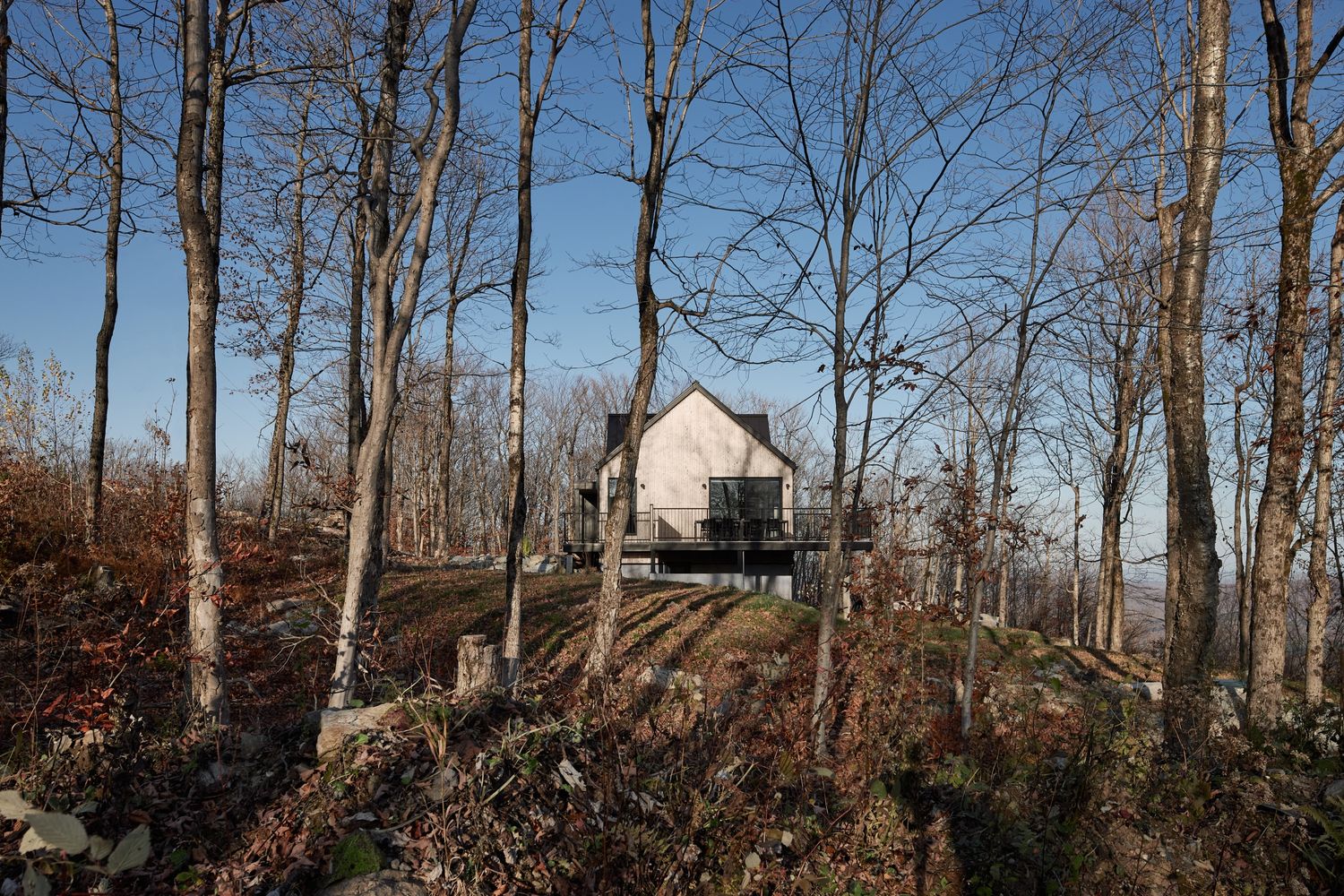Conçu pour s'intégrer harmonieusement à son environnement, le chalet Les Cousins ne cherche pas à dominer le paysage, mais plutôt à en faire partie. Les matériaux choisis, ainsi que la conception globale du bâtiment, ont été pensés pour s'harmoniser avec la beauté naturelle de l'Estrie. L'emploi du béton brut, en écho aux formations rocheuses du mont Bolton, montre un profond respect pour le cadre naturel tout en ajoutant une touche contemporaine. Chaque espace de ce chalet a été conçu pour optimiser le confort et l'expérience des résidents et invités. Dès l'entrée dans le chalet, la généreuse fenestration sert de cadre panoramique à l'horizon montagneux et aux lacs sereins de l'Estrie. Les levers et couchers de soleil offrent un spectacle quotidien, chaque saison apportant sa propre palette de couleurs vibrantes. Les trois chambres, bien qu'intimement connectées à la nature par leurs vues, offrent chacune une sensation unique, garantissant que chaque visiteur trouve un espace qui lui ressemble. Le hamac en mezzanine, au-delà de son rôle de relaxation, joue astucieusement avec la lumière naturelle, créant un espace accueillant dès le seuil franchi.