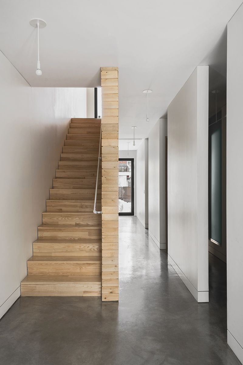 Afin de profiter d’un maximum d’éclairage naturel sur cette parcelle étroite de 20 pieds de largeur et de 90 pieds de longueur, les pièces de vie, constituant un grand volume ouvert, se trouvent à l’étage de la maison. Cette configuration reprend l’idée du ‘’piano nobile’’, le premier étage des demeures italiennes pourvu de grandes fenêtres. Le rez-de-chaussée accueille un vestibule donnant sur la rue, un autre donnant sur la ruelle, ainsi que la circulation menant aux différents étages. Deux chambres et deux salles de bain se retrouvent également au rez-de-chaussée. La mezzanine, entourée de toits et d’arbres, accueille le bureau qui sert aussi de chambre d’invités. Le sous-sol est utilisé comme salle de jeu.