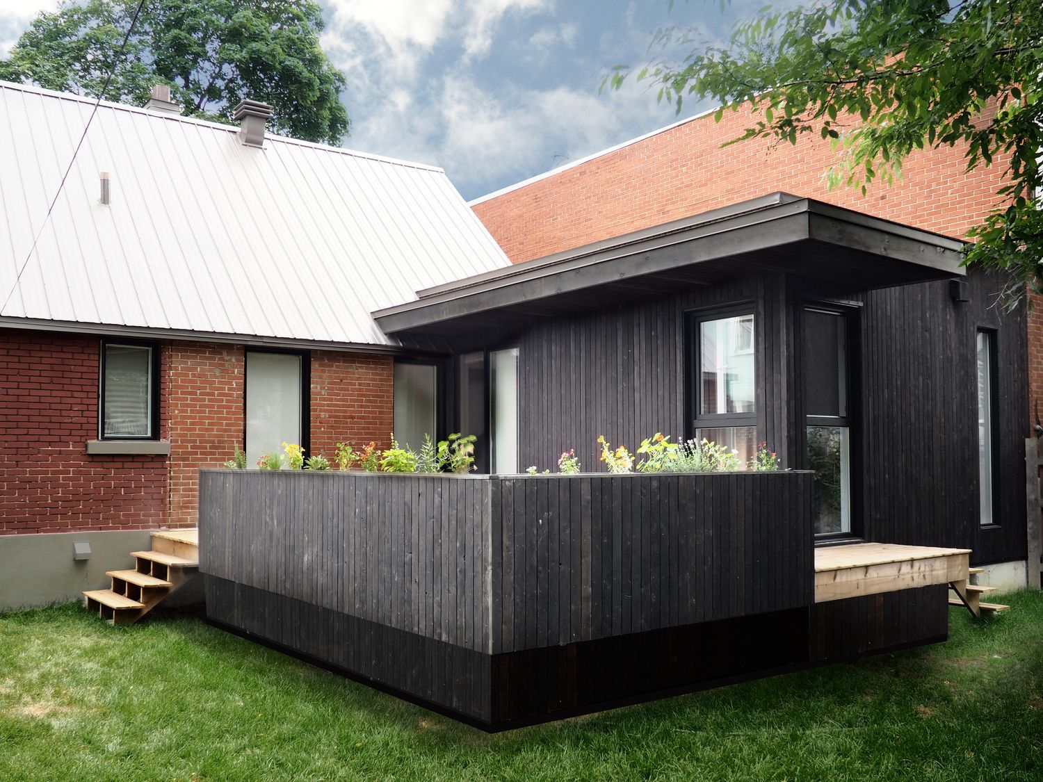 Les deux enfants de la famille grandissant, la petite maison de type ‘’vétéran’’ est devenue bien étriquée. Ses pièces de vie cloisonnées et sombres répondent mal aux besoins de ses occupants. Deux options se posent: déménager, ou agrandir. Les maisons possédant trois chambres sont chères dans le secteur, et souvent fort mal rénovées. Le quartier est agréable, les voisins sympathiques. La famille décide donc de se lancer dans le projet de rénovation et d’agrandissement de la propriété. La maison est rafraîchie, décloisonnée, et agrandie pour répondre aux usages nécessaires: ajout d’une chambre et d’une petite salle de bain pour les parents, vestibule plus généreux, création d’un petit bureau, et d’une cuisine fonctionnelle. Le choix se porte sur l’insertion d’un volume de 500 pieds carrés dans la bande étroite située entre la maison et le voisin, d’à peine 9 pieds de large. Sans aucun usage attribué, cet espace résiduel permet d’agrandir le rez-de-chaussée en empiétant très peu sur la cour arrière. La cuisine intègre donc cet espace tout en longueur, et s’ouvre largement sur la rue, sur le salon et la salle à manger. Une fois les anciennes cloisons enlevées, la lumière se diffuse par les quatre faces de la maison. A l’arrière, la suite des parents profite de la vue et du calme verdoyant de la grande cour ensoleillée. Le parement extérieur de l’agrandissement, ainsi que les bacs à fleurs qui ceinturent la terrasse aménagée en arrière sont en bois brûlé, ce qui permet de protéger le bois contre les UV, les intempéries et les insectes, et augmente donc considérablement sa durée de vie. Le nouveau volume long et bas en bois noir se marie tout en douceur avec la forme classique et la brique rouge de la maison d’origine.