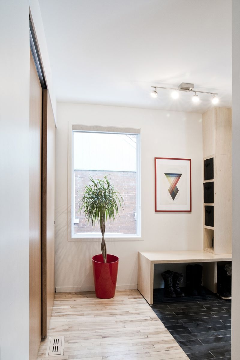 Les deux enfants de la famille grandissant, la petite maison de type ‘’vétéran’’ est devenue bien étriquée. Ses pièces de vie cloisonnées et sombres répondent mal aux besoins de ses occupants. Deux options se posent: déménager, ou agrandir. Les maisons possédant trois chambres sont chères dans le secteur, et souvent fort mal rénovées. Le quartier est agréable, les voisins sympathiques. La famille décide donc de se lancer dans le projet de rénovation et d’agrandissement de la propriété. La maison est rafraîchie, décloisonnée, et agrandie pour répondre aux usages nécessaires: ajout d’une chambre et d’une petite salle de bain pour les parents, vestibule plus généreux, création d’un petit bureau, et d’une cuisine fonctionnelle. Le choix se porte sur l’insertion d’un volume de 500 pieds carrés dans la bande étroite située entre la maison et le voisin, d’à peine 9 pieds de large. Sans aucun usage attribué, cet espace résiduel permet d’agrandir le rez-de-chaussée en empiétant très peu sur la cour arrière. La cuisine intègre donc cet espace tout en longueur, et s’ouvre largement sur la rue, sur le salon et la salle à manger. Une fois les anciennes cloisons enlevées, la lumière se diffuse par les quatre faces de la maison. A l’arrière, la suite des parents profite de la vue et du calme verdoyant de la grande cour ensoleillée. Le parement extérieur de l’agrandissement, ainsi que les bacs à fleurs qui ceinturent la terrasse aménagée en arrière sont en bois brûlé, ce qui permet de protéger le bois contre les UV, les intempéries et les insectes, et augmente donc considérablement sa durée de vie. Le nouveau volume long et bas en bois noir se marie tout en douceur avec la forme classique et la brique rouge de la maison d’origine.