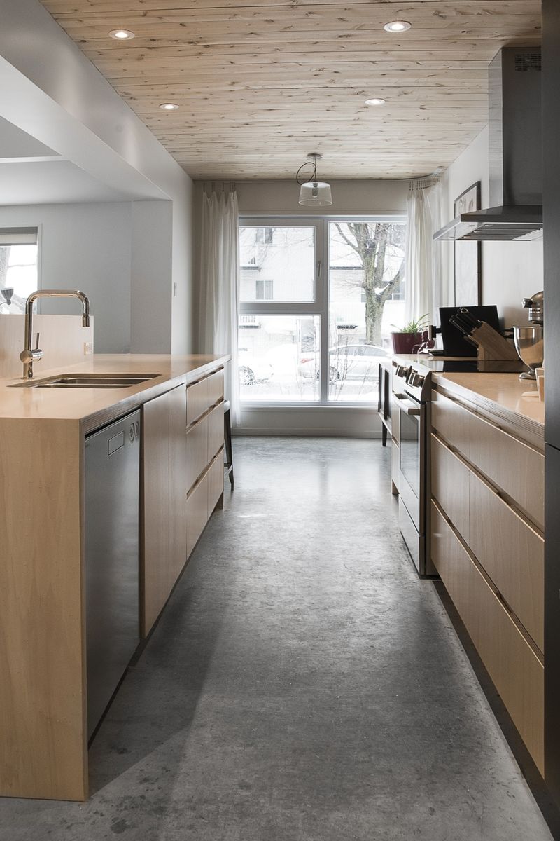 Les deux enfants de la famille grandissant, la petite maison de type ‘’vétéran’’ est devenue bien étriquée. Ses pièces de vie cloisonnées et sombres répondent mal aux besoins de ses occupants. Deux options se posent: déménager, ou agrandir. Les maisons possédant trois chambres sont chères dans le secteur, et souvent fort mal rénovées. Le quartier est agréable, les voisins sympathiques. La famille décide donc de se lancer dans le projet de rénovation et d’agrandissement de la propriété. La maison est rafraîchie, décloisonnée, et agrandie pour répondre aux usages nécessaires: ajout d’une chambre et d’une petite salle de bain pour les parents, vestibule plus généreux, création d’un petit bureau, et d’une cuisine fonctionnelle. Le choix se porte sur l’insertion d’un volume de 500 pieds carrés dans la bande étroite située entre la maison et le voisin, d’à peine 9 pieds de large. Sans aucun usage attribué, cet espace résiduel permet d’agrandir le rez-de-chaussée en empiétant très peu sur la cour arrière. La cuisine intègre donc cet espace tout en longueur, et s’ouvre largement sur la rue, sur le salon et la salle à manger. Une fois les anciennes cloisons enlevées, la lumière se diffuse par les quatre faces de la maison. A l’arrière, la suite des parents profite de la vue et du calme verdoyant de la grande cour ensoleillée. Le parement extérieur de l’agrandissement, ainsi que les bacs à fleurs qui ceinturent la terrasse aménagée en arrière sont en bois brûlé, ce qui permet de protéger le bois contre les UV, les intempéries et les insectes, et augmente donc considérablement sa durée de vie. Le nouveau volume long et bas en bois noir se marie tout en douceur avec la forme classique et la brique rouge de la maison d’origine.
